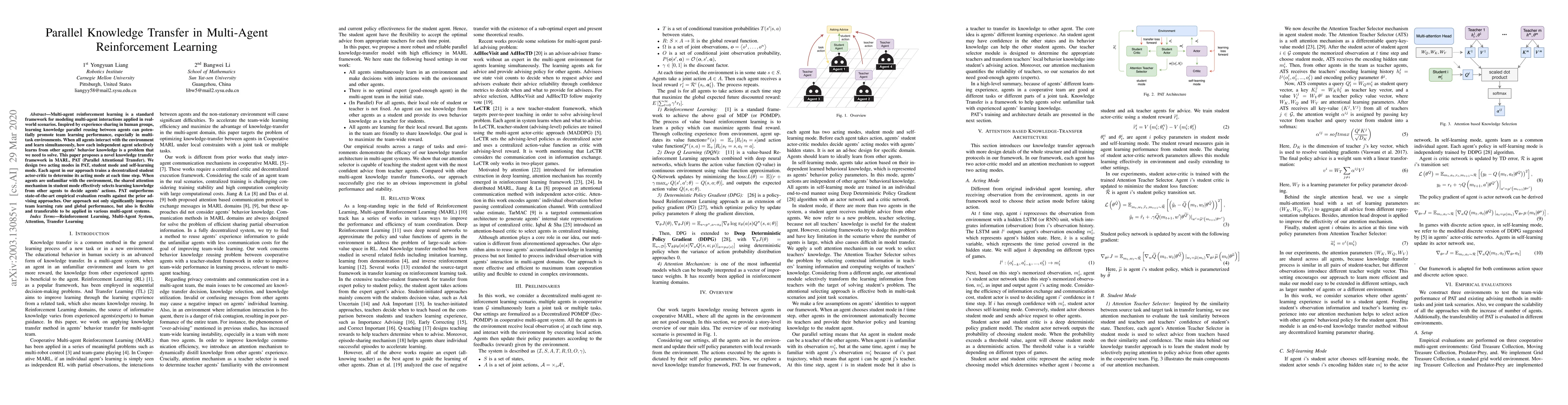 Multi-agent reinforcement learning is a standard framework for modeling multi-agent interactions applied in real-world scenarios. Inspired by experience sharing in human groups, learning knowledge parallel reusing between agents can potentially promote team learning performance, especially in multi-task environments. When all agents interact with the environment and learn simultaneously, how each independent agent selectively learns from other agents' behavior knowledge is a problem that we need to solve. This paper proposes a novel knowledge transfer framework in MARL, PAT (Parallel Attentional Transfer). We design two acting modes in PAT, student mode and self-learning mode. Each agent in our approach trains a decentralized student actor-critic to determine its acting mode at each time step. When agents are unfamiliar with the environment, the shared attention mechanism in student mode effectively selects learning knowledge from other agents to decide agents' actions. PAT outperforms state-of-the-art empirical evaluation results against the prior advising approaches. Our approach not only significantly improves team learning rate and global performance, but also is flexible and transferable to be applied in various multi-agent systems.