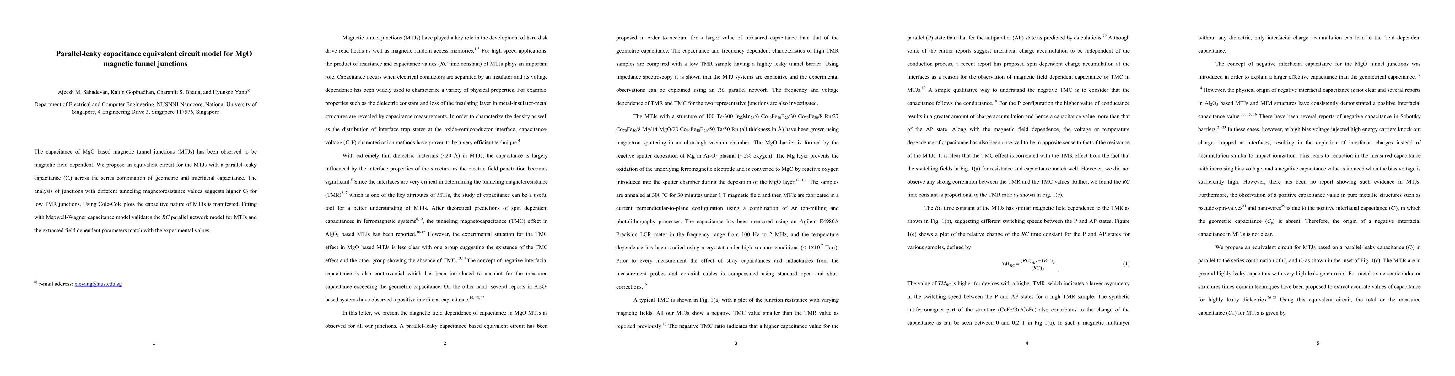 This paper proposes an equivalent circuit model for MgO-based magnetic tunnel junctions (MTJs) featuring a parallel-leaky capacitance across the series combination of geometric and interfacial capacitance. The model is validated using experimental data and fits well with Maxwell-Wagner capacitance, showing higher parallel-leaky capacitance in low tunneling magnetoresistance junctions.