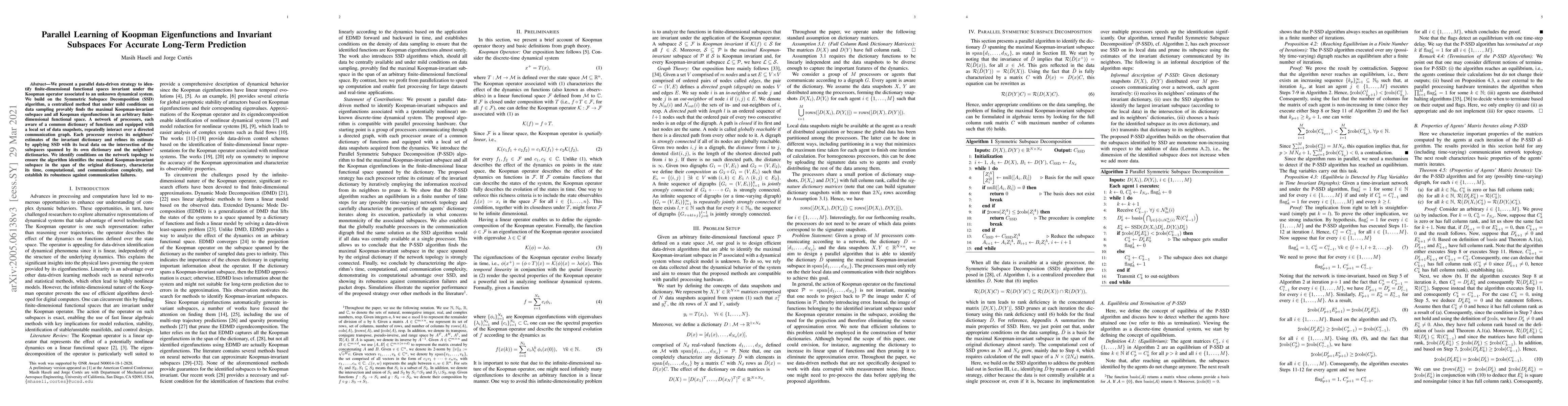 This paper proposes a parallel algorithm to identify Koopman-invariant subspaces and eigenfunctions for long-term prediction of dynamical systems using a network of processors. The method leverages the Symmetric Subspace Decomposition algorithm and ensures robustness against communication failures while characterizing its computational and communication complexities.