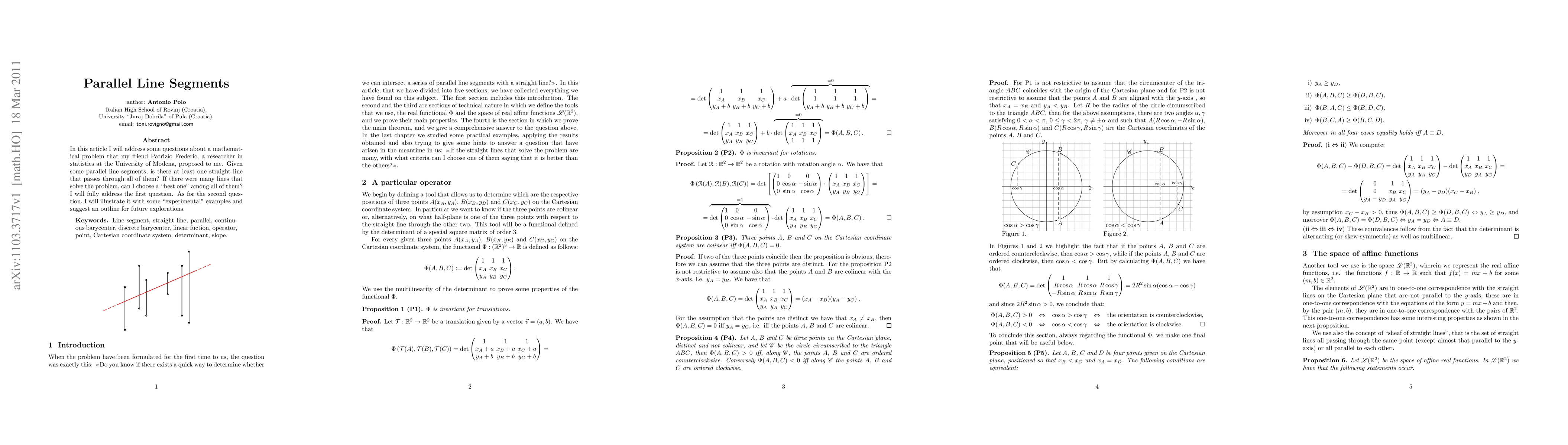 The paper presents a mathematical analysis of parallel line segments, addressing the existence of a straight line passing through all segments and proposing conditions for selecting an optimal line among multiple solutions.