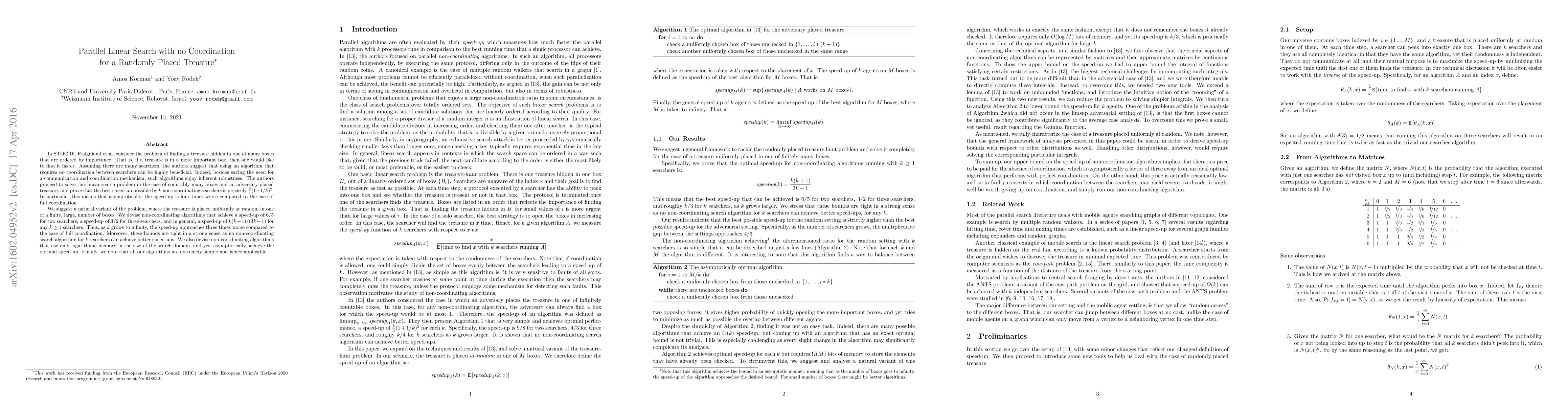 In STOC'16, Fraigniaud et al. consider the problem of finding a treasure hidden in one of many boxes that are ordered by importance. That is, if a treasure is in a more important box, then one would like to find it faster. Assuming there are many searchers, the authors suggest that using an algorithm that requires no coordination between searchers can be highly beneficial. Indeed, besides saving the need for a communication and coordination mechanism, such algorithms enjoy inherent robustness. The authors proceed to solve this linear search problem in the case of countably many boxes and an adversary placed treasure, and prove that the best speed-up possible by $k$ non-coordinating searchers is precisely $\frac{k}{4}(1+1/k)^2$. In particular, this means that asymptotically, the speed-up is four times worse compared to the case of full coordination. We suggest an important variant of the problem, where the treasure is placed uniformly at random in one of a finite, large, number of boxes. We devise non-coordinating algorithms that achieve a speed-up of $6/5$ for two searchers, a speed-up of $3/2$ for three searchers, and in general, a speed-up of $k(k+1)/(3k-1)$ for any $k \geq 1$ searchers. Thus, as $k$ grows to infinity, the speed-up approaches three times worse compared to the case of full coordination. Moreover, these bounds are tight in a strong sense as no non-coordinating search algorithm for $k$ searchers can achieve better speed-ups. We also devise non-coordinating algorithms that use only logarithmic memory in the size of the search domain, and yet, asymptotically, achieve the optimal speed-up. Finally, we note that all our algorithms are extremely simple and hence applicable.