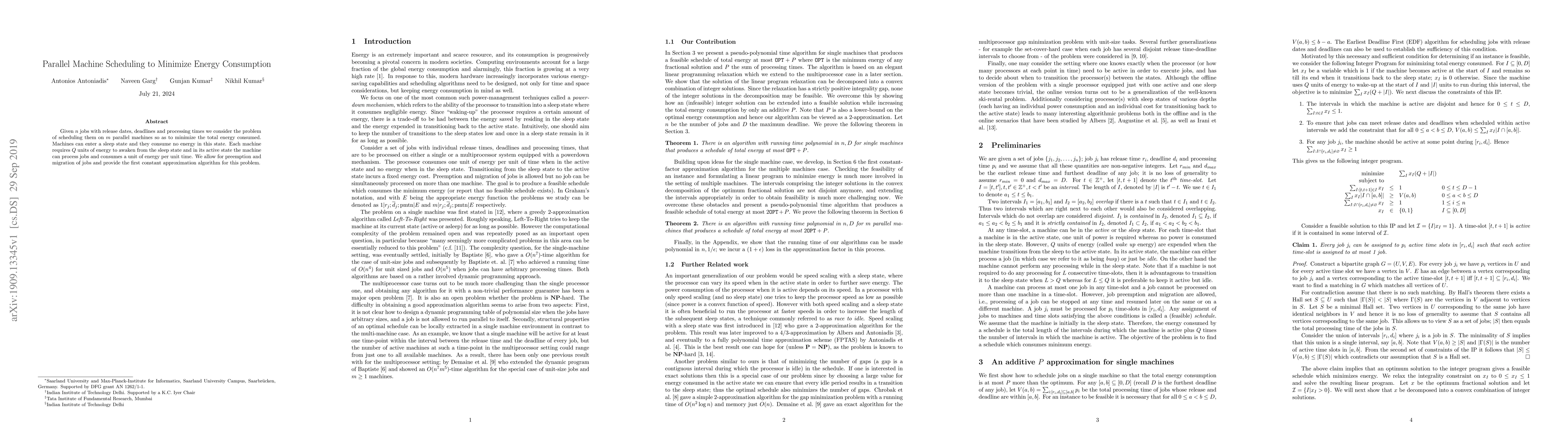 This paper presents a constant approximation algorithm for scheduling n jobs on m parallel machines to minimize total energy consumption, where machines can sleep to save energy but require Q units to awaken. The algorithm allows job preemption and migration.