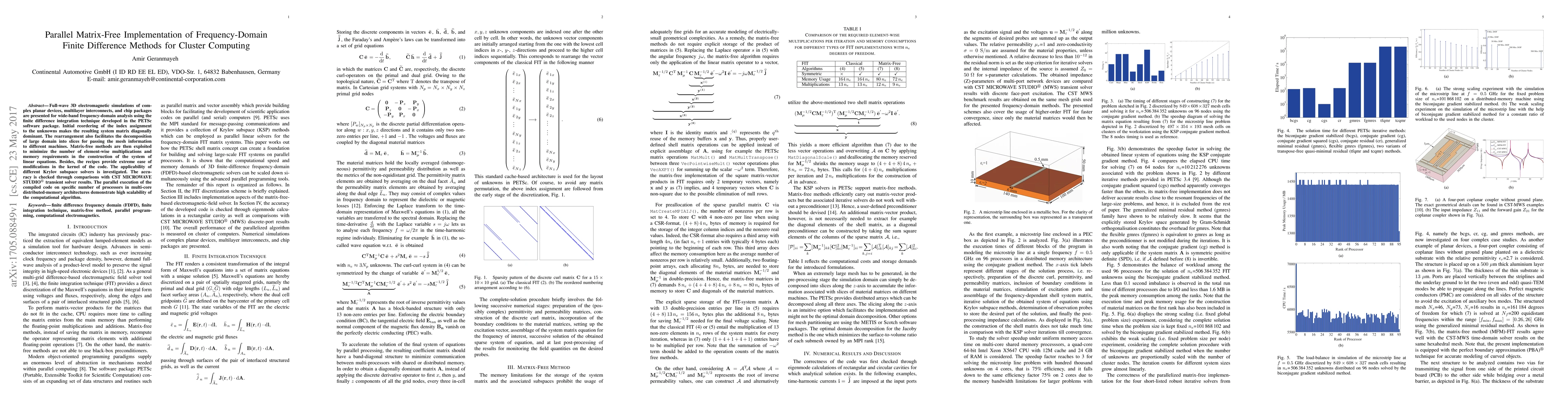 Full-wave 3D electromagnetic simulations of complex planar devices, multilayer interconnects, and chip packages are presented for wide-band frequency-domain analysis using the finite difference integration technique developed in the PETSc software package. Initial reordering of the index assignment to the unknowns makes the resulting system matrix diagonally dominant. The rearrangement also facilitates the decomposition of large domain into slices for passing the mesh information to different machines. Matrix-free methods are then exploited to minimize the number of element-wise multiplications and memory requirements in the construction of the system of linear equations. Besides, the recipes provide extreme ease of modifications in the kernel of the code. The applicability of different Krylov subspace solvers is investigated. The accuracy is checked through comparisons with CST MICROWAVE STUDIO transient solver results. The parallel execution of the compiled code on specific number of processors in multi-core distributed-memory architectures demonstrate high scalability of the computational algorithm.