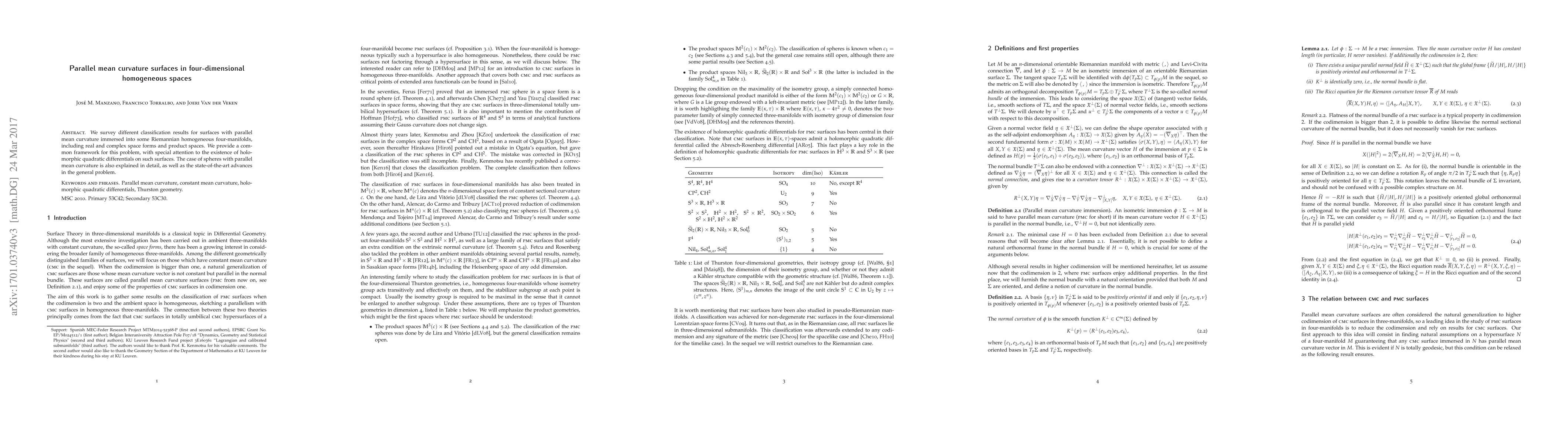 This paper surveys classification results for surfaces with parallel mean curvature in four-dimensional Riemannian homogeneous spaces, emphasizing holomorphic quadratic differentials and detailed analysis of spheres with parallel mean curvature. It provides a unified framework for understanding these geometric objects.