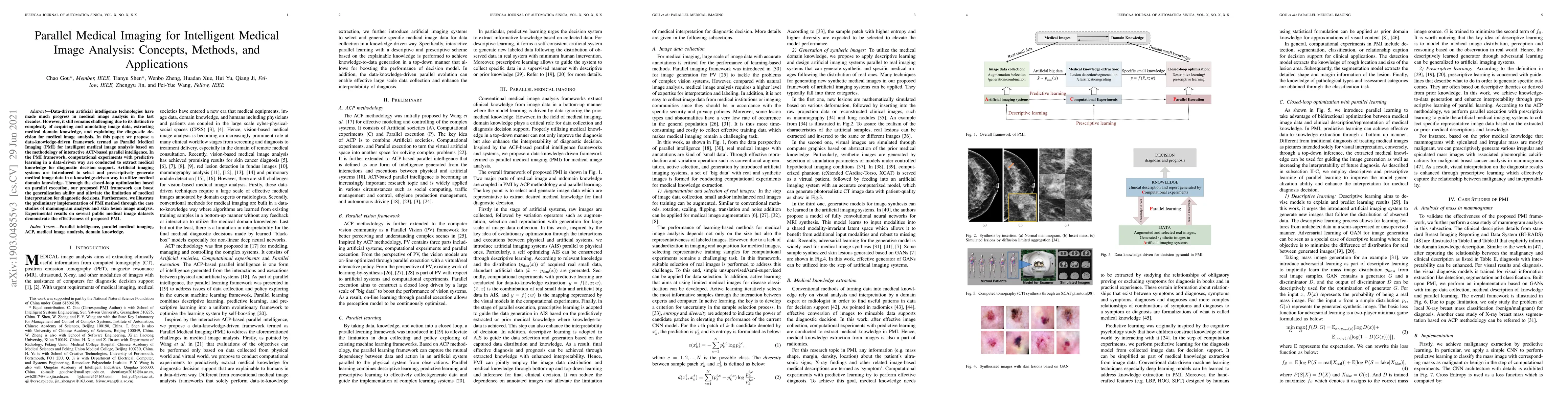 There has been much progress in data-driven artificial intelligence technology for medical image analysis in the last decades. However, it still remains challenging due to its distinctive complexity of acquiring and annotating image data, extracting medical domain knowledge, and explaining the diagnostic decision for medical image analysis. In this paper, we propose a data-knowledge-driven framework termed as Parallel Medical Imaging (PMI) for intelligent medical image analysis based on the methodology of interactive ACP-based parallel intelligence. In the PMI framework, computational experiments with predictive learning in a data-driven way are conducted to extract medical knowledge for diagnostic decision support. Artificial imaging systems are introduced to select and prescriptively generate medical image data in a knowledge-driven way to utilize medical domain knowledge. Through the closed-loop optimization based on parallel execution, our proposed PMI framework can boost the generalization ability and alleviate the limitation of medical interpretation for diagnostic decisions. Furthermore, we illustrate the preliminary implementation of PMI method through the case studies of mammogram analysis and skin lesion image analysis. Experimental results on several public medical image datasets demonstrate the effectiveness of proposed PMI.