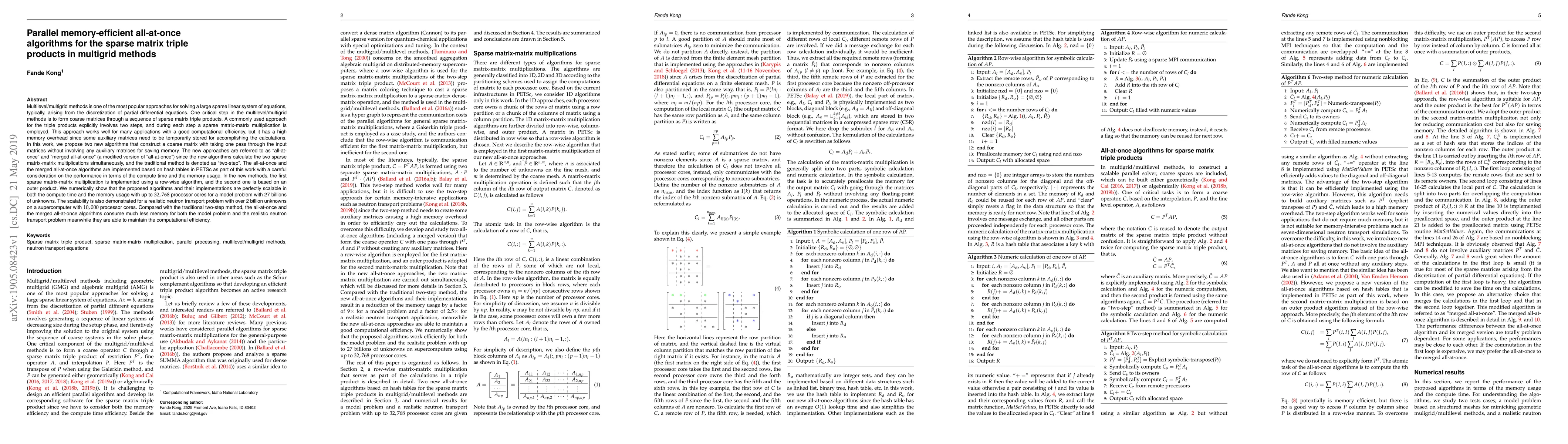 This paper proposes memory-efficient "all-at-once" and "merged all-at-once" algorithms for sparse matrix triple products in multigrid methods, eliminating the need for auxiliary matrices. These new methods show scalability in compute time and memory usage, outperforming the traditional two-step method in memory consumption while maintaining computational efficiency.