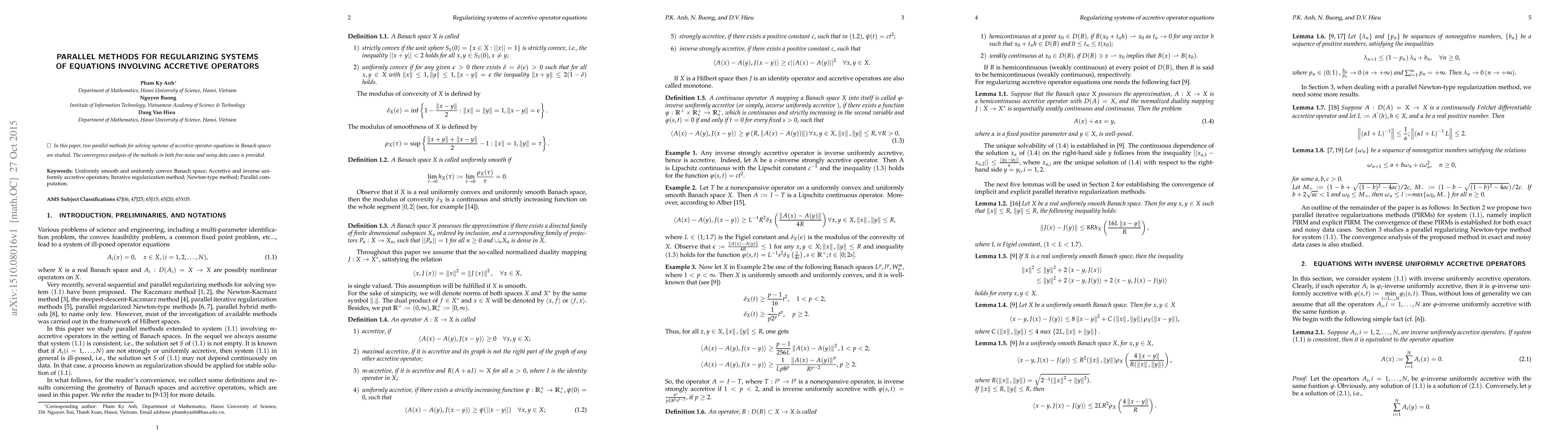 This paper investigates two parallel methods for solving systems of accretive operator equations in Banach spaces, providing convergence analysis for both noise-free and noisy data scenarios.