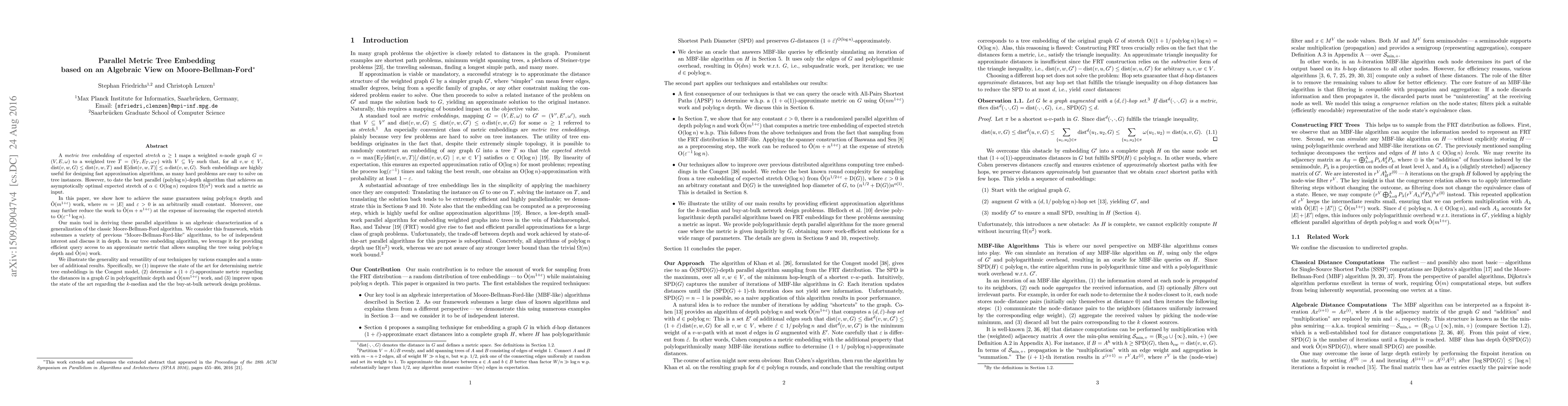 A \emph{metric tree embedding} of expected \emph{stretch~$\alpha \geq 1$} maps a weighted $n$-node graph $G = (V, E, \omega)$ to a weighted tree $T = (V_T, E_T, \omega_T)$ with $V \subseteq V_T$ such that, for all $v,w \in V$, $\operatorname{dist}(v, w, G) \leq \operatorname{dist}(v, w, T)$ and $operatorname{E}[\operatorname{dist}(v, w, T)] \leq \alpha \operatorname{dist}(v, w, G)$. Such embeddings are highly useful for designing fast approximation algorithms, as many hard problems are easy to solve on tree instances. However, to date the best parallel $(\operatorname{polylog} n)$-depth algorithm that achieves an asymptotically optimal expected stretch of $\alpha \in \operatorname{O}(\log n)$ requires $\operatorname{\Omega}(n^2)$ work and a metric as input. In this paper, we show how to achieve the same guarantees using $\operatorname{polylog} n$ depth and $\operatorname{\tilde{O}}(m^{1+\epsilon})$ work, where $m = |E|$ and $\epsilon > 0$ is an arbitrarily small constant. Moreover, one may further reduce the work to $\operatorname{\tilde{O}}(m + n^{1+\epsilon})$ at the expense of increasing the expected stretch to $\operatorname{O}(\epsilon^{-1} \log n)$. Our main tool in deriving these parallel algorithms is an algebraic characterization of a generalization of the classic Moore-Bellman-Ford algorithm. We consider this framework, which subsumes a variety of previous "Moore-Bellman-Ford-like" algorithms, to be of independent interest and discuss it in depth. In our tree embedding algorithm, we leverage it for providing efficient query access to an approximate metric that allows sampling the tree using $\operatorname{polylog} n$ depth and $\operatorname{\tilde{O}}(m)$ work. We illustrate the generality and versatility of our techniques by various examples and a number of additional results.