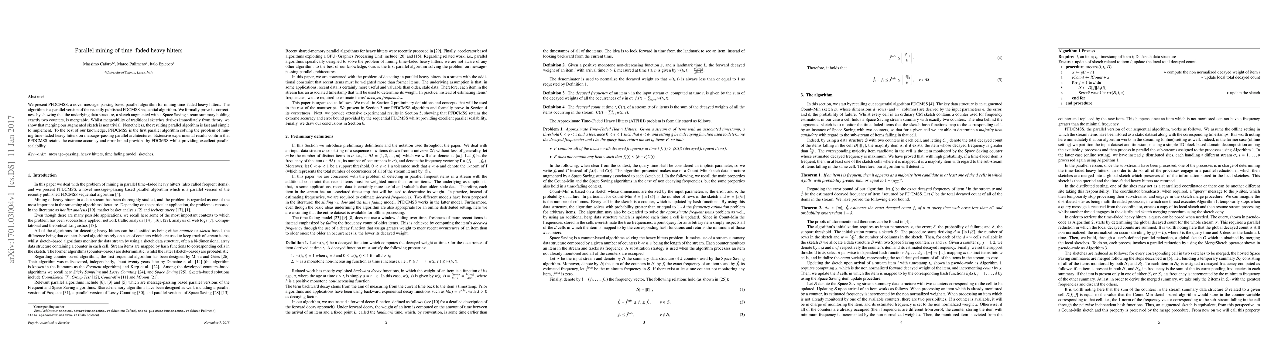 This paper introduces PFDCMSS, a parallel algorithm for mining time-faded heavy hitters using a message-passing approach. It proves the correctness of the algorithm by demonstrating the mergeability of its augmented sketch, and shows that PFDCMSS maintains accuracy and scalability compared to its sequential counterpart.