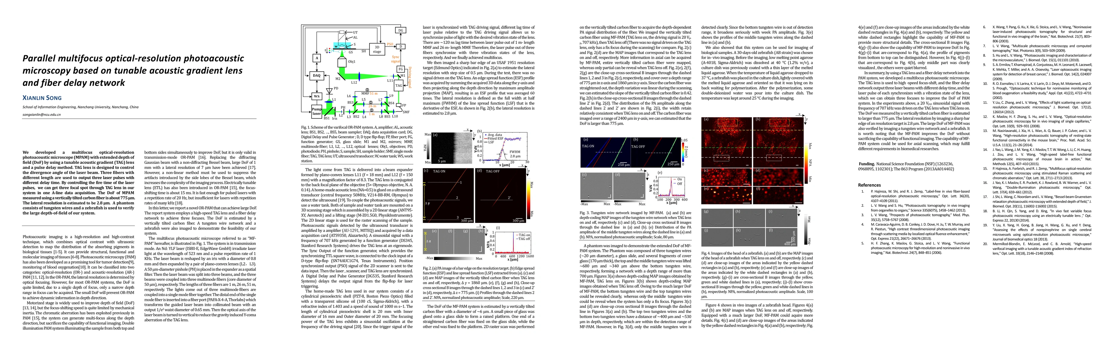 This paper presents a multifocus optical-resolution photoacoustic microscopy (MPAM) utilizing a tunable acoustic gradient lens and fiber delay network to achieve an extended depth of field of 775 micrometers, with a lateral resolution of 2.8 micrometers, validated through phantom and zebrafish imaging.