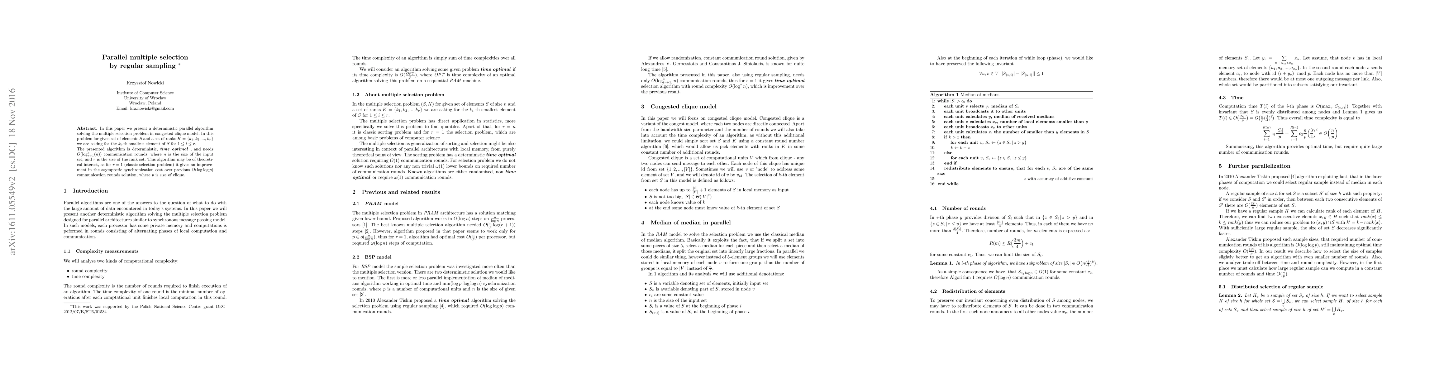 In this paper we present a deterministic parallel algorithm solving the multiple selection problem in congested clique model. In this problem for given set of elements S and a set of ranks $K = \{k_1 , k_2 , ..., k_r \}$ we are asking for the $k_i$-th smallest element of $S$ for $1 \leq i \leq r$. The presented algorithm is deterministic, time optimal , and needs $O(\log^*_{r+1} (n))$ communication rounds, where $n$ is the size of the input set, and $r$ is the size of the rank set. This algorithm may be of theoretical interest, as for $r = 1$ (classic selection problem) it gives an improvement in the asymptotic synchronization cost over previous $O(\log \log p)$ communication rounds solution, where $p$ is size of clique.