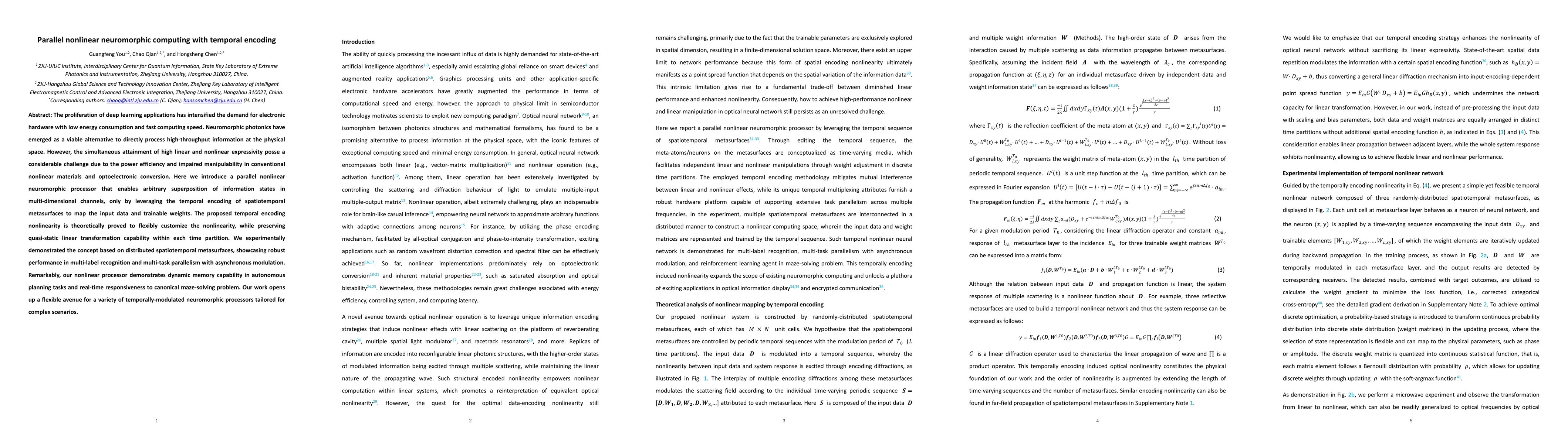 The proliferation of deep learning applications has intensified the demand for electronic hardware with low energy consumption and fast computing speed. Neuromorphic photonics have emerged as a viable alternative to directly process high-throughput information at the physical space. However, the simultaneous attainment of high linear and nonlinear expressivity posse a considerable challenge due to the power efficiency and impaired manipulability in conventional nonlinear materials and optoelectronic conversion. Here we introduce a parallel nonlinear neuromorphic processor that enables arbitrary superposition of information states in multi-dimensional channels, only by leveraging the temporal encoding of spatiotemporal metasurfaces to map the input data and trainable weights. The proposed temporal encoding nonlinearity is theoretically proved to flexibly customize the nonlinearity, while preserving quasi-static linear transformation capability within each time partition. We experimentally demonstrated the concept based on distributed spatiotemporal metasurfaces, showcasing robust performance in multi-label recognition and multi-task parallelism with asynchronous modulation. Remarkably, our nonlinear processor demonstrates dynamic memory capability in autonomous planning tasks and real-time responsiveness to canonical maze-solving problem. Our work opens up a flexible avenue for a variety of temporally-modulated neuromorphic processors tailored for complex scenarios.