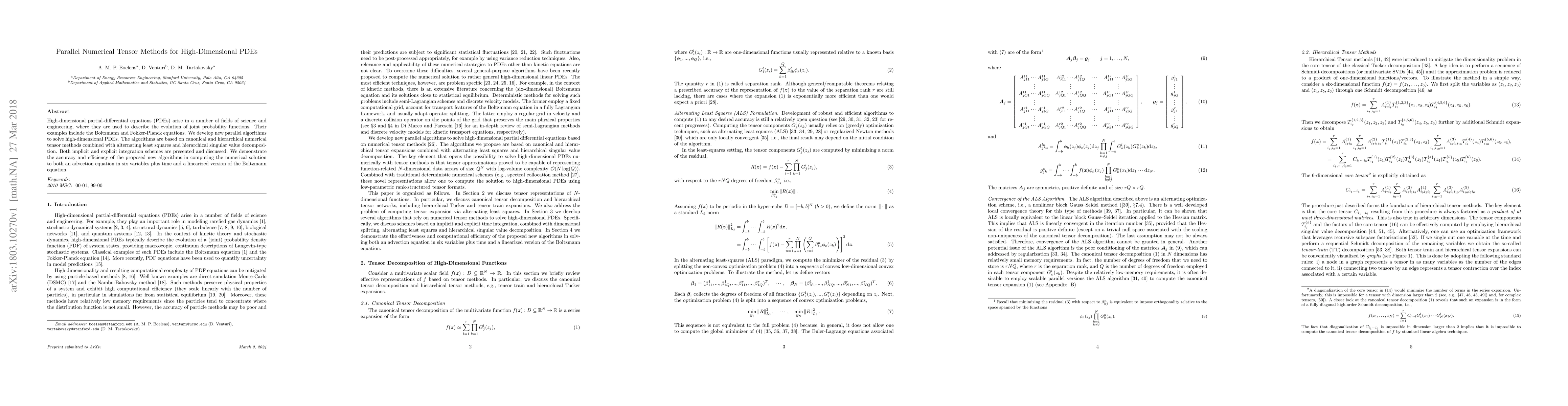 High-dimensional partial-differential equations (PDEs) arise in a number of fields of science and engineering, where they are used to describe the evolution of joint probability functions. Their examples include the Boltzmann and Fokker-Planck equations. We develop new parallel algorithms to solve high-dimensional PDEs. The algorithms are based on canonical and hierarchical numerical tensor methods combined with alternating least squares and hierarchical singular value decomposition. Both implicit and explicit integration schemes are presented and discussed. We demonstrate the accuracy and efficiency of the proposed new algorithms in computing the numerical solution to both an advection equation in six variables plus time and a linearized version of the Boltzmann equation.