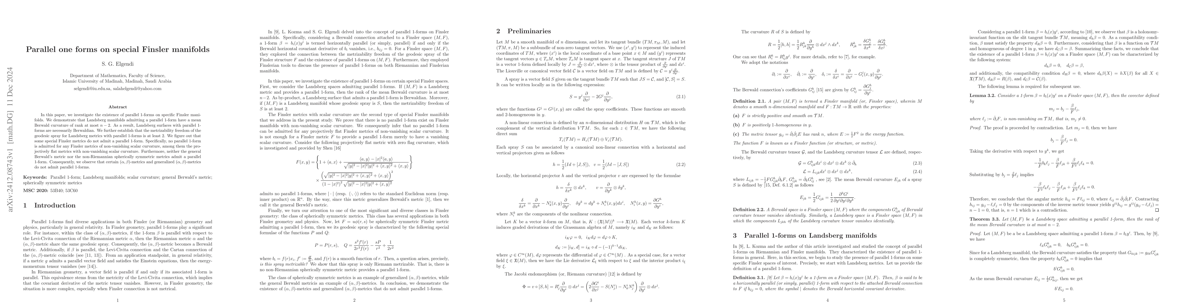 This paper explores the presence of parallel 1-forms on specific Finsler manifolds, demonstrating that Landsberg manifolds with such forms have a mean Berwald curvature of rank at most $n-2$. It concludes that Landsberg surfaces with parallel 1-forms are Berwaldian, and reveals that certain special Finsler metrics, including those with non-vanishing scalar curvature, do not support parallel 1-forms.