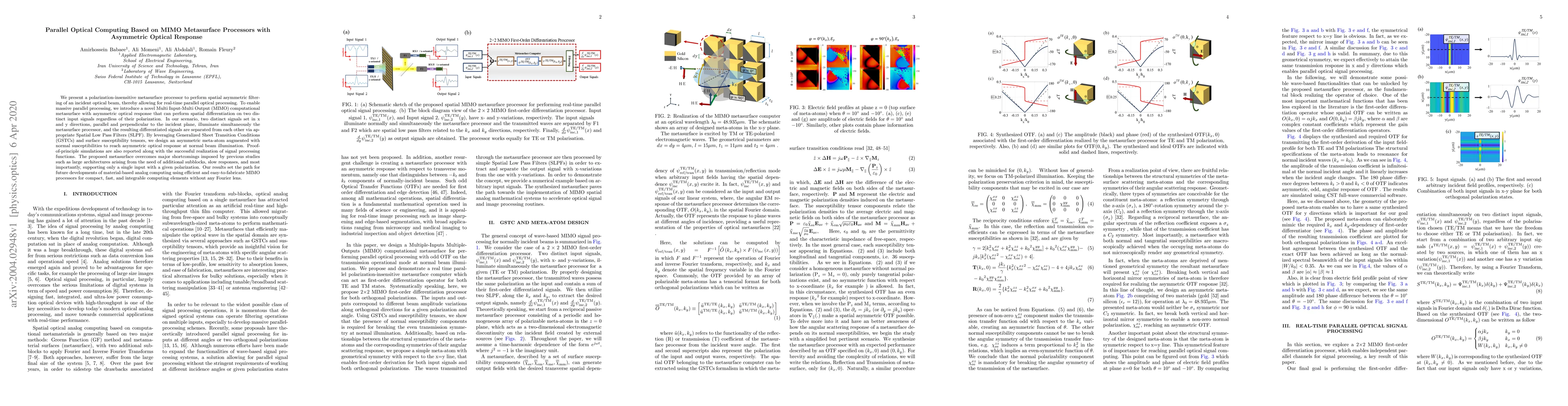 This paper introduces a novel MIMO metasurface processor for real-time parallel optical processing, capable of spatial asymmetric filtering and differentiation of two distinct input signals regardless of polarization. The proposed metasurface overcomes the limitations of previous designs, enabling compact, fast, and integrable computing elements.