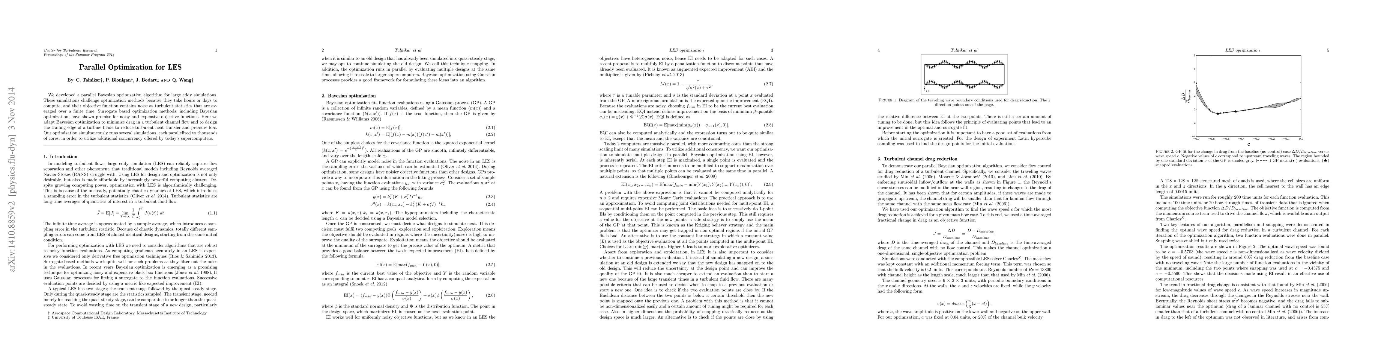 We developed a parallel Bayesian optimization algorithm for large eddy simulations. These simulations challenge optimization methods because they take hours or days to compute, and their objective function contains noise as turbulent statistics that are averaged over a finite time. Surrogate based optimization methods, including Bayesian optimization, have shown promise for noisy and expensive objective functions. Here we adapt Bayesian optimization to minimize drag in a turbulent channel flow and to design the trailing edge of a turbine blade to reduce turbulent heat transfer and pressure loss. Our optimization simultaneously runs several simulations, each parallelized to thousands of cores, in order to utilize additional concurrency offered by today's supercomputers.