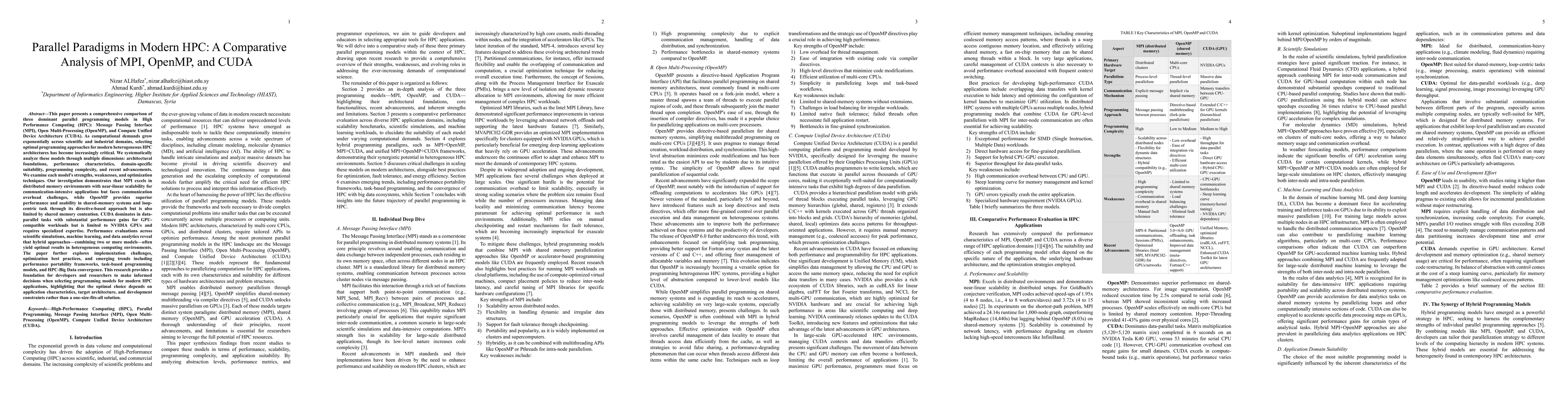This paper presents a comprehensive comparison of three dominant parallel programming models in High Performance Computing (HPC): Message Passing Interface (MPI), Open Multi-Processing (OpenMP), and Compute Unified Device Architecture (CUDA). Selecting optimal programming approaches for modern heterogeneous HPC architectures has become increasingly critical. We systematically analyze these models across multiple dimensions: architectural foundations, performance characteristics, domain-specific suitability, programming complexity, and recent advancements. We examine each model's strengths, weaknesses, and optimization techniques. Our investigation demonstrates that MPI excels in distributed memory environments with near-linear scalability for communication-intensive applications, but faces communication overhead challenges. OpenMP provides strong performance and usability in shared-memory systems and loop-centric tasks, though it is limited by shared memory contention. CUDA offers substantial performance gains for data-parallel GPU workloads, but is restricted to NVIDIA GPUs and requires specialized expertise. Performance evaluations across scientific simulations, machine learning, and data analytics reveal that hybrid approaches combining two or more models often yield optimal results in heterogeneous environments. The paper also discusses implementation challenges, optimization best practices, and emerging trends such as performance portability frameworks, task-based programming, and the convergence of HPC and Big Data. This research helps developers and researchers make informed decisions when selecting programming models for modern HPC applications, emphasizing that the best choice depends on application requirements, hardware, and development constraints.