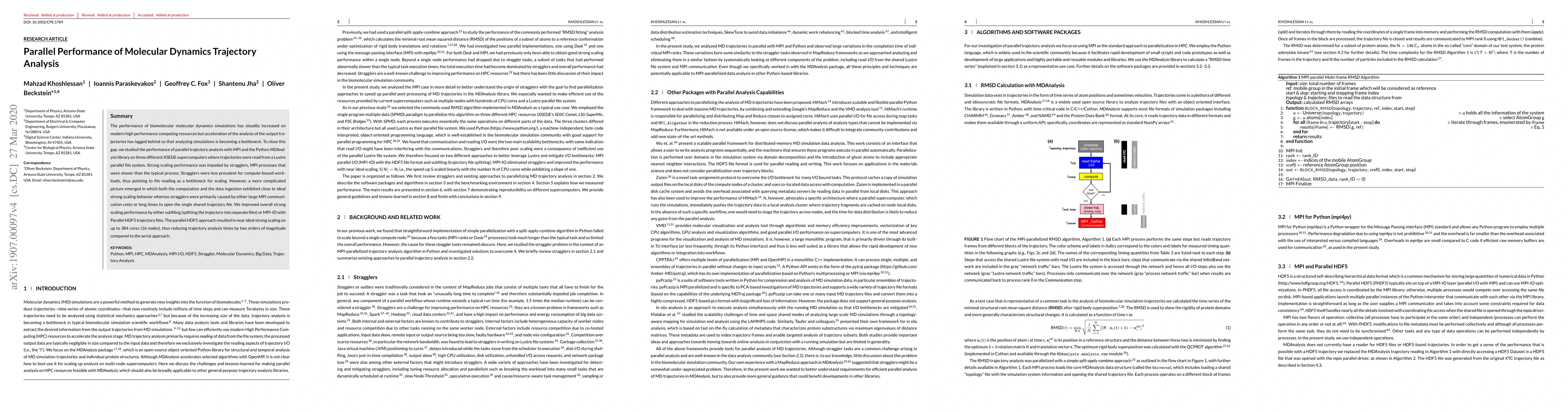 This paper investigates the parallel performance of molecular dynamics trajectory analysis using MPI and the Python MDAnalysis library on supercomputers. It finds that stragglers impede strong scaling, with file reading as a significant bottleneck, but both computation and data ingestion show near-ideal scaling. Improved performance was achieved through subfiling or MPI-IO with Parallel HDF5, which reduced analysis times by two orders of magnitude on up to 384 cores.