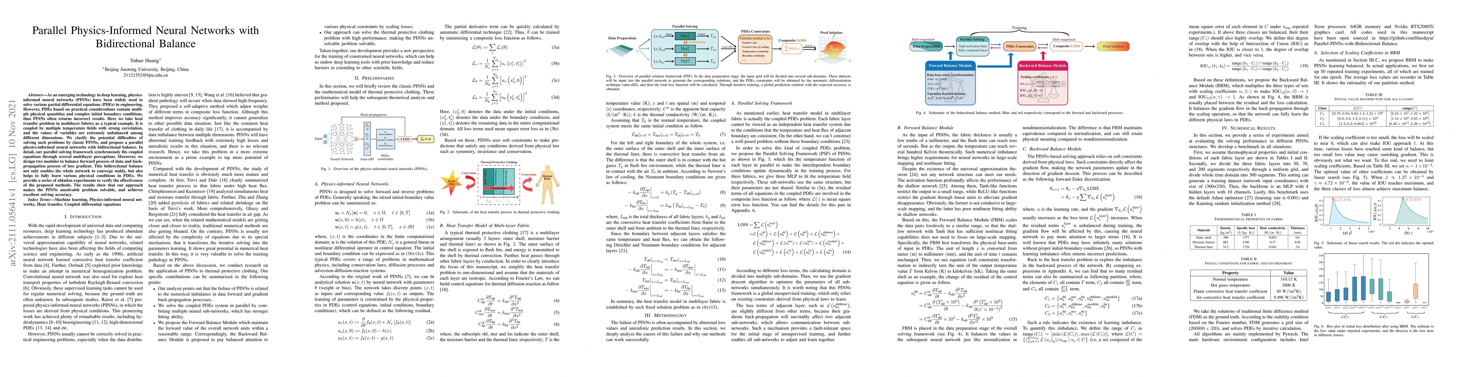 As an emerging technology in deep learning, physics-informed neural networks (PINNs) have been widely used to solve various partial differential equations (PDEs) in engineering. However, PDEs based on practical considerations contain multiple physical quantities and complex initial boundary conditions, thus PINNs often returns incorrect results. Here we take heat transfer problem in multilayer fabrics as a typical example. It is coupled by multiple temperature fields with strong correlation, and the values of variables are extremely unbalanced among different dimensions. We clarify the potential difficulties of solving such problems by classic PINNs, and propose a parallel physics-informed neural networks with bidirectional balance. In detail, our parallel solving framework synchronously fits coupled equations through several multilayer perceptions. Moreover, we design two modules to balance forward process of data and back-propagation process of loss gradient. This bidirectional balance not only enables the whole network to converge stably, but also helps to fully learn various physical conditions in PDEs. We provide a series of ablation experiments to verify the effectiveness of the proposed methods. The results show that our approach makes the PINNs unsolvable problem solvable, and achieves excellent solving accuracy.