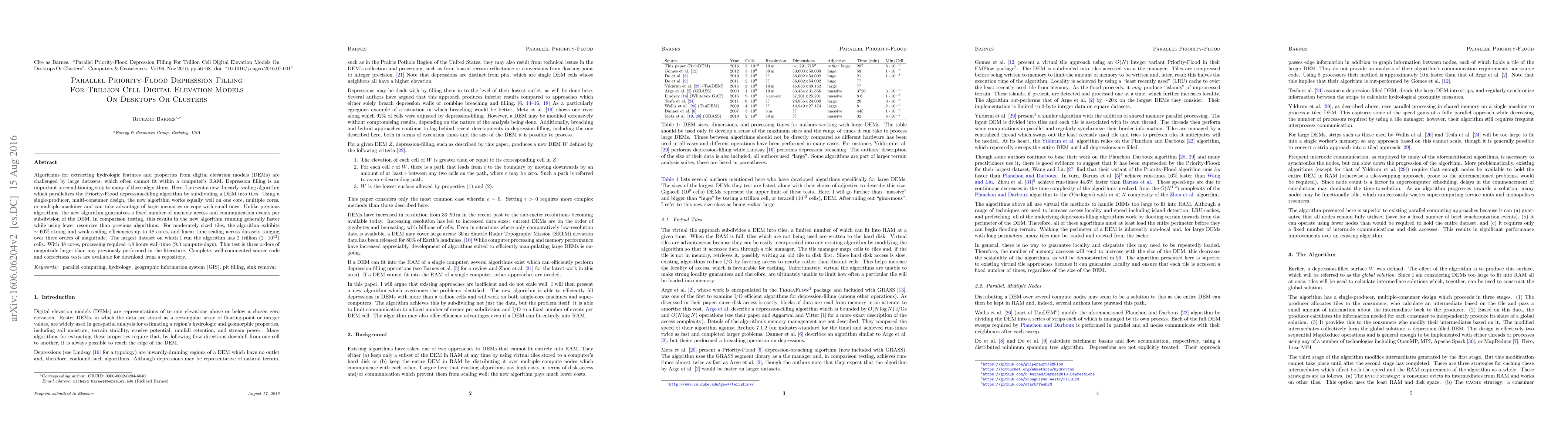 This paper introduces a parallel priority-flood depression-filling algorithm for processing trillion-cell digital elevation models, which scales linearly across multiple cores and machines. The algorithm subdivides the DEM into tiles, ensuring efficient resource use and performance, achieving up to 60% scaling efficiency with 48 cores.