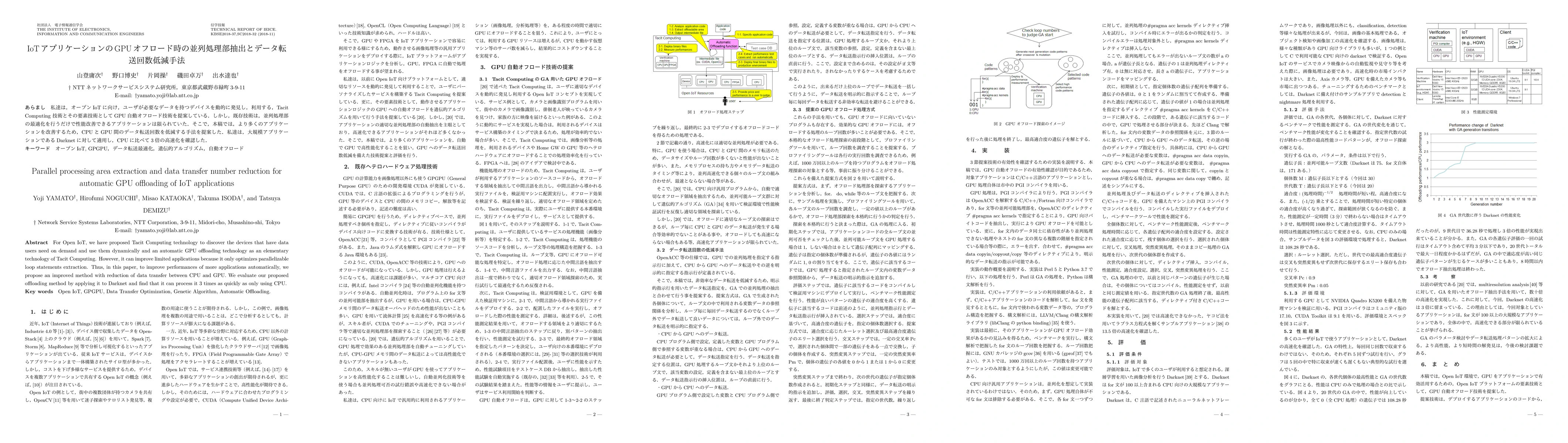 This paper proposes an improved method for automatic GPU offloading in IoT applications by optimizing parallel processing and reducing data transfer between CPU and GPU, achieving up to three times faster processing for applications like Darknet compared to CPU-only processing.