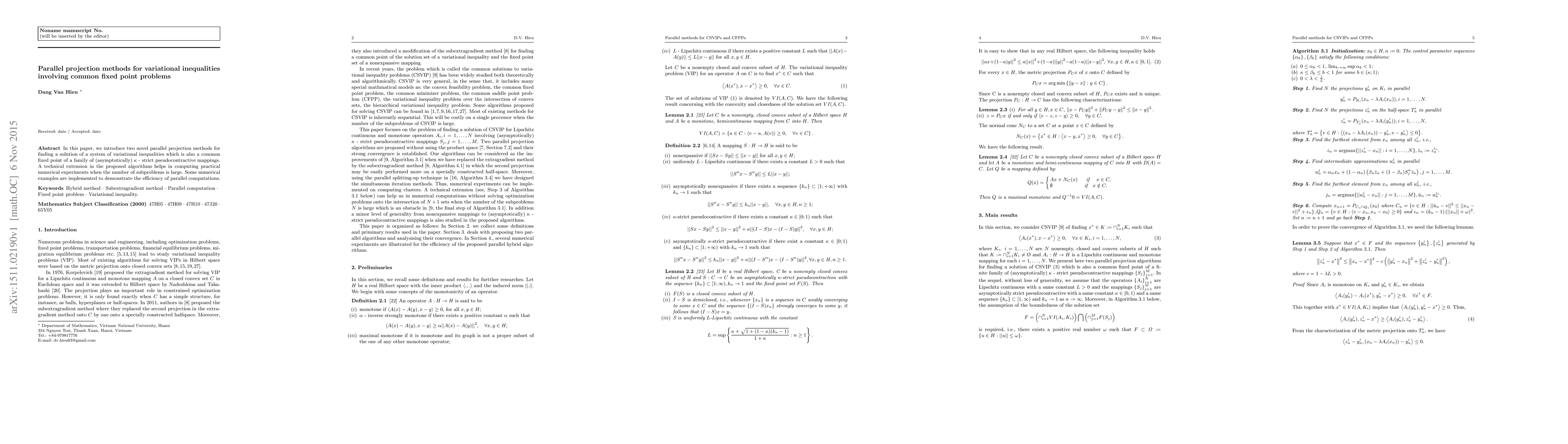This paper proposes two new parallel projection methods for solving variational inequalities that also serve as common fixed points for a set of asymptotically $\kappa$-strict pseudocontractive mappings. The methods are enhanced for large-scale problems, and numerical examples show their computational efficiency.