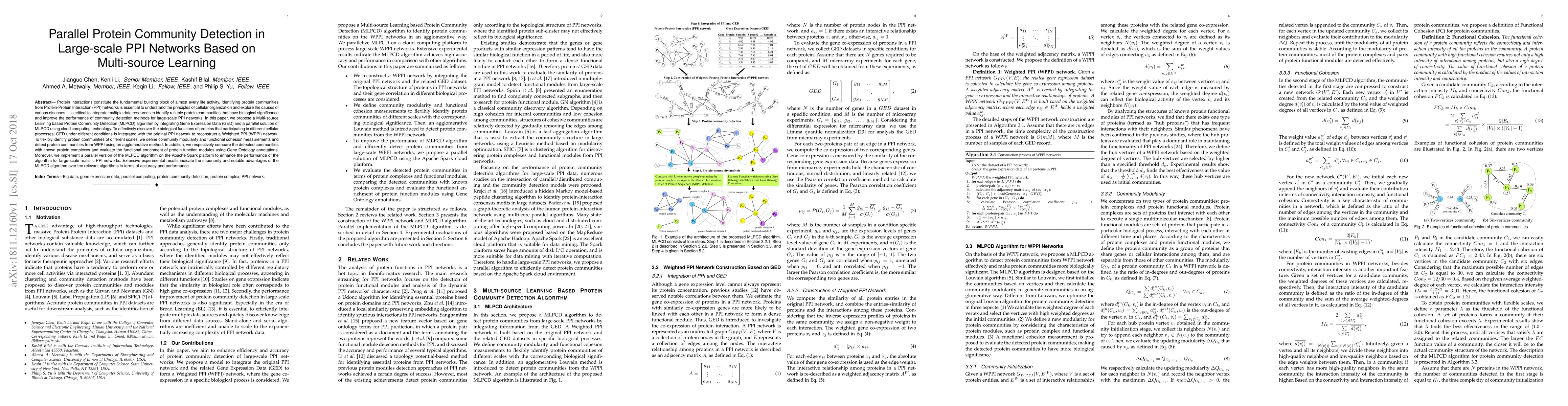 This paper proposes a Multi-source Learning based Protein Community Detection (MLPCD) algorithm that integrates Gene Expression Data with Protein-Protein Interaction networks to identify biologically significant protein communities. The algorithm employs parallel processing on Apache Spark for scalability and accuracy, demonstrating superior performance compared to existing methods.
