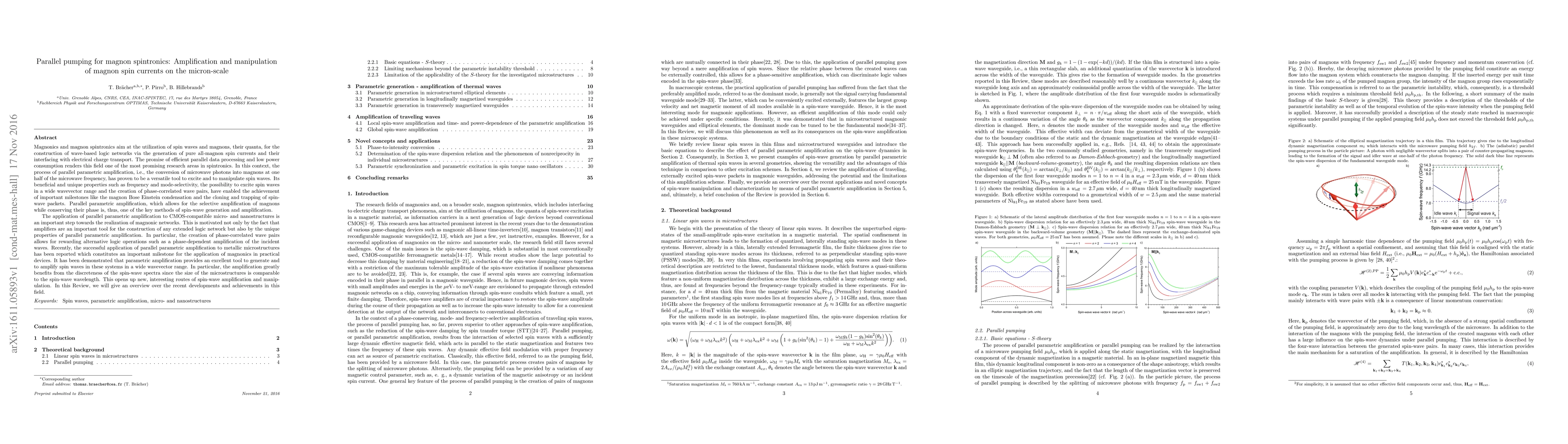 The paper presents a comprehensive review of recent developments and achievements in parallel pumping for magnon spintronics, highlighting its potential for amplification and manipulation of magnon spin currents on the micron-scale.