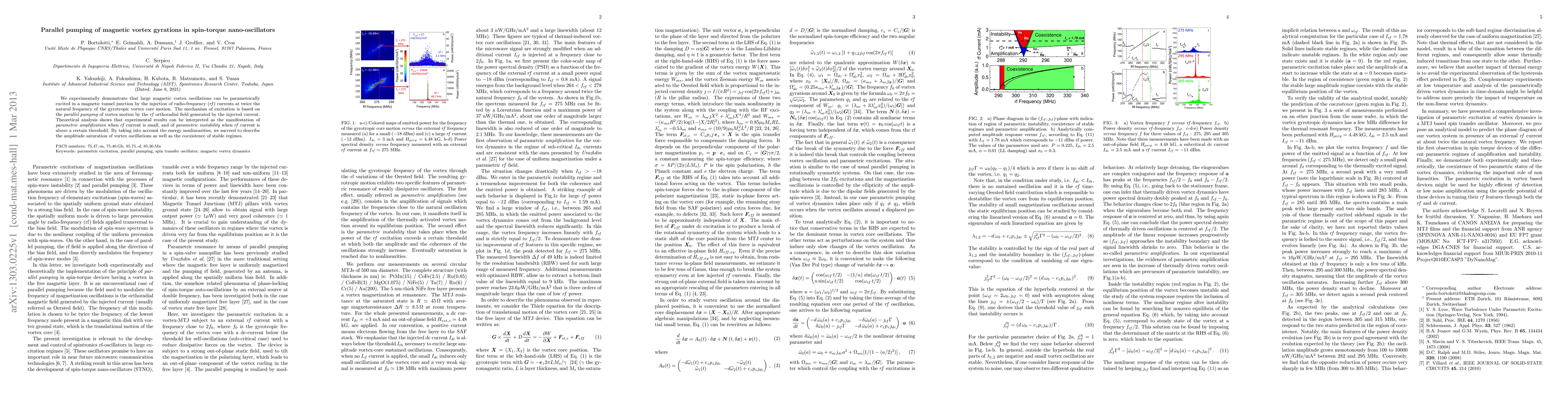 We experimentally demonstrate that large magnetic vortex oscillations can be parametrically excited in a magnetic tunnel junction by the injection of radio-frequency (rf) currents at twice the natural frequency of the gyrotropic vortex core motion. The mechanism of excitation is based on the parallel pumping of vortex motion by the rf orthoradial field generated by the injected current. Theoretical analysis shows that experimental results can be interpreted as the manifestation of parametric amplification when rf current is small, and of parametric instability when rf current is above a certain threshold. By taking into account the energy nonlinearities, we succeed to describe the amplitude saturation of vortex oscillations as well as the coexistence of stable regimes.