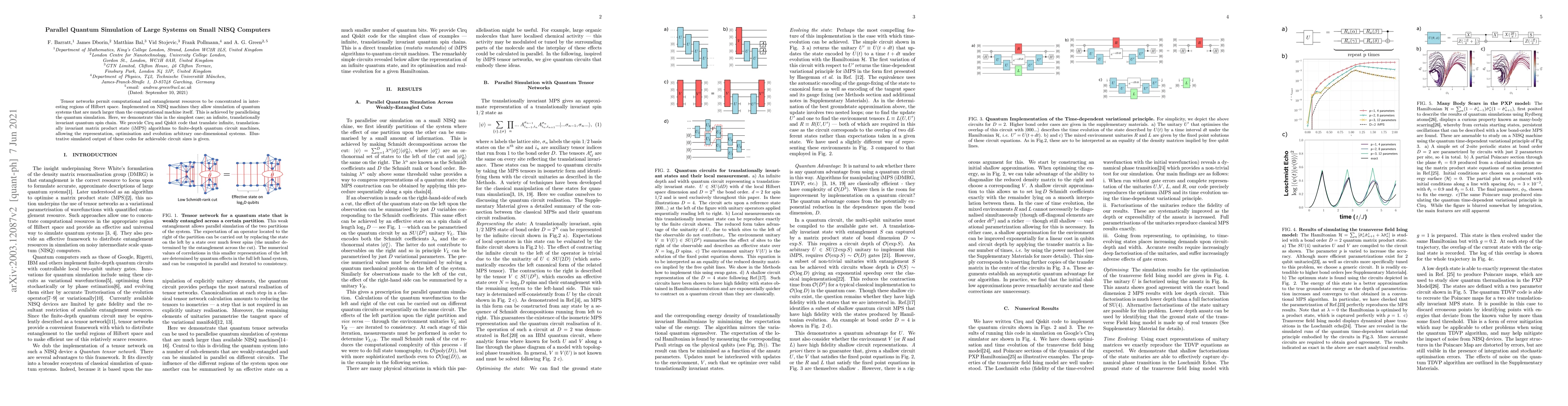 Tensor networks permit computational and entanglement resources to be concentrated in interesting regions of Hilbert space. Implemented on NISQ machines they allow simulation of quantum systems that are much larger than the computational machine itself. This is achieved by parallelising the quantum simulation. Here, we demonstrate this in the simplest case; an infinite, translationally invariant quantum spin chain. We provide Cirq and Qiskit code that translate infinite, translationally invariant matrix product state (iMPS) algorithms to finite-depth quantum circuit machines, allowing the representation, optimisation and evolution arbitrary one-dimensional systems. Illustrative simulated output of these codes for achievable circuit sizes is given.