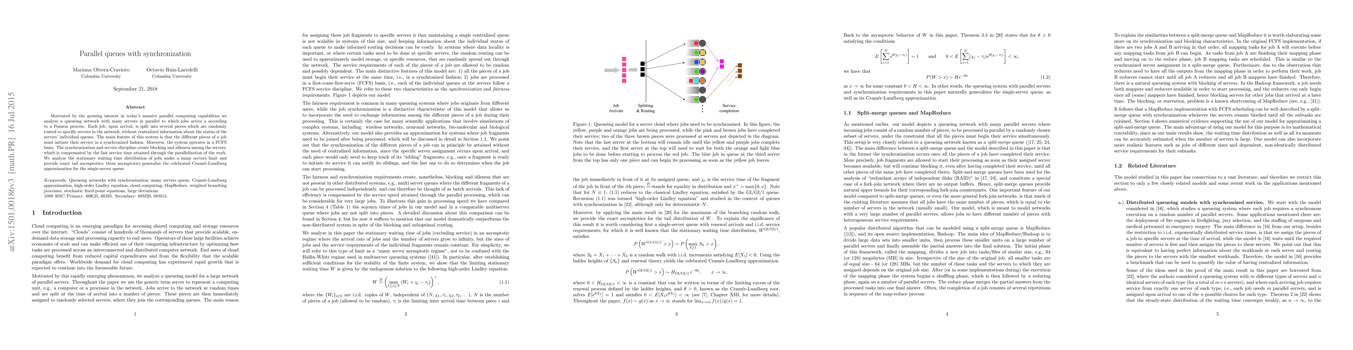Motivated by the growing interest in today's massive parallel computing capabilities we analyze a queueing network with many servers in parallel to which jobs arrive a according to a Poisson process. Each job, upon arrival, is split into several pieces which are randomly routed to specific servers in the network, without centralized information about the status of the servers' individual queues. The main feature of this system is that the different pieces of a job must initiate their service in a synchronized fashion. Moreover, the system operates in a FCFS basis. The synchronization and service discipline create blocking and idleness among the servers, which is compensated by the fast service time attained through the parallelization of the work. We analyze the stationary waiting time distribution of jobs under a many servers limit and provide exact tail asymptotics; these asymptotics generalize the celebrated Cram\'er-Lundberg approximation for the single-server queue.