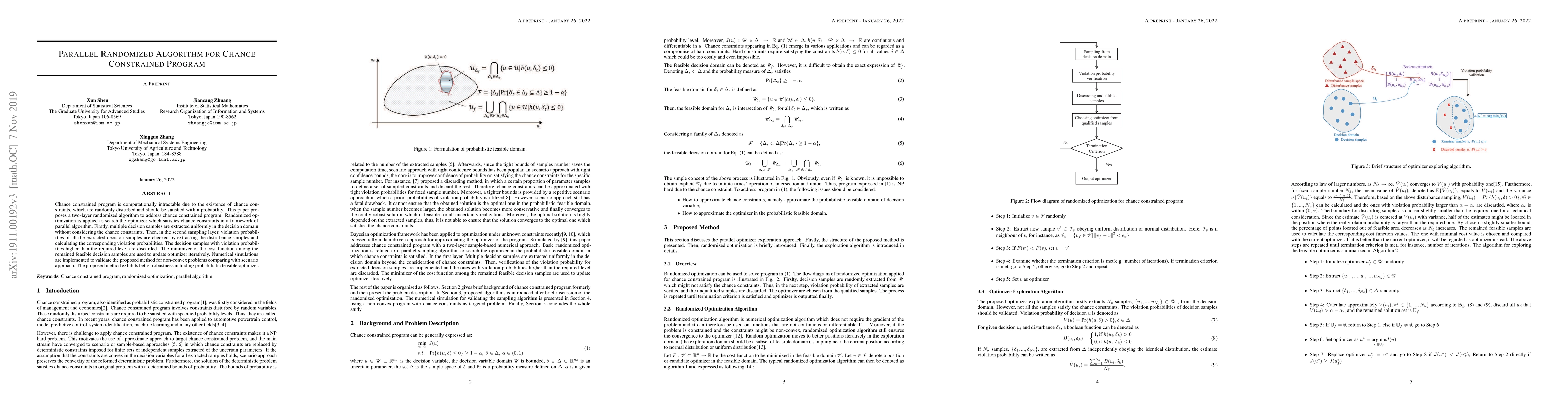 Chance constrained program is computationally intractable due to the existence of chance constraints, which are randomly disturbed and should be satisfied with a probability. This paper proposes a two-layer randomized algorithm to address chance constrained program. Randomized optimization is applied to search the optimizer which satisfies chance constraints in a framework of parallel algorithm. Firstly, multiple decision samples are extracted uniformly in the decision domain without considering the chance constraints. Then, in the second sampling layer, violation probabilities of all the extracted decision samples are checked by extracting the disturbance samples and calculating the corresponding violation probabilities. The decision samples with violation probabilities higher than the required level are discarded. The minimizer of the cost function among the remained feasible decision samples are used to update optimizer iteratively. Numerical simulations are implemented to validate the proposed method for non-convex problems comparing with scenario approach. The proposed method exhibits better robustness in finding probabilistic feasible optimizer.