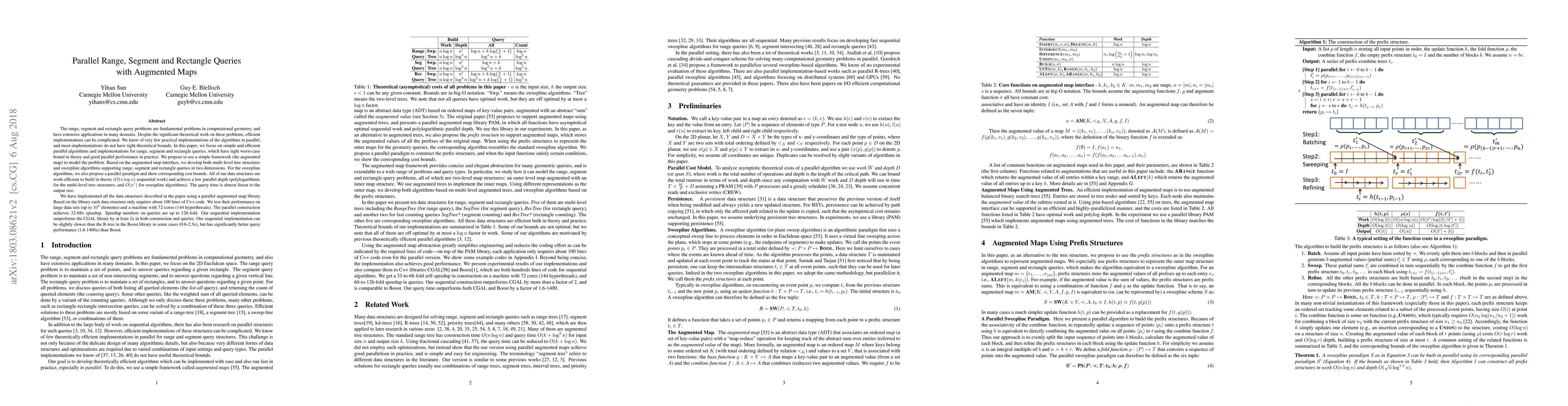 This paper presents efficient parallel algorithms for range, segment, and rectangle queries using augmented maps. The proposed multi-level tree structures and sweepline algorithms achieve tight theoretical bounds and low parallel depth, with implementations requiring only 100 lines of C++ code each. The parallel construction and query performance show significant speedups, outperforming existing libraries in both construction and query efficiency.