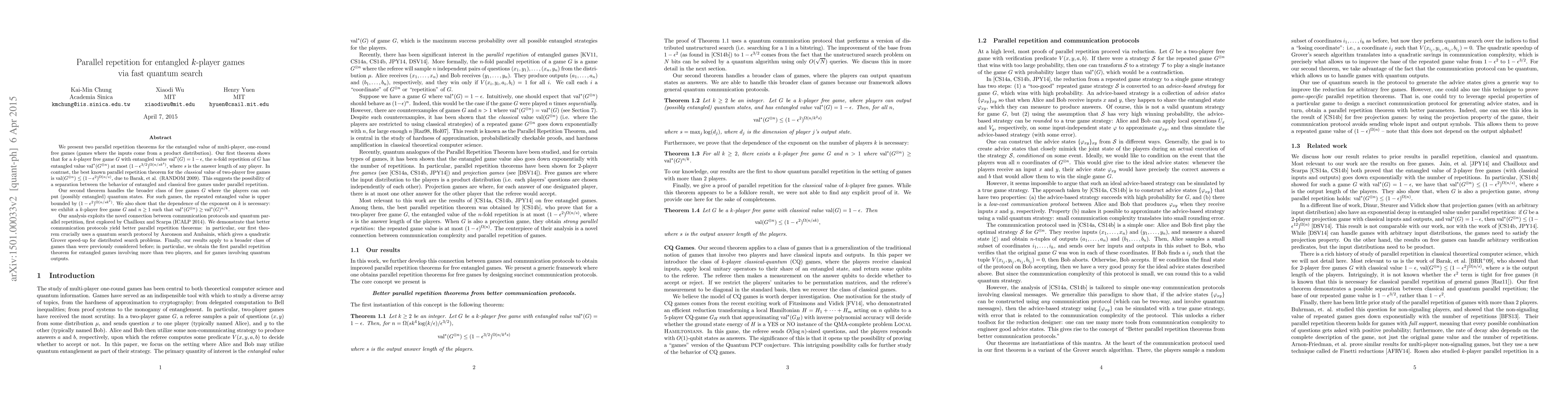 We present two parallel repetition theorems for the entangled value of multi-player, one-round free games (games where the inputs come from a product distribution). Our first theorem shows that for a $k$-player free game $G$ with entangled value $\mathrm{val}^*(G) = 1 - \epsilon$, the $n$-fold repetition of $G$ has entangled value $\mathrm{val}^*(G^{\otimes n})$ at most $(1 - \epsilon^{3/2})^{\Omega(n/sk^4)}$, where $s$ is the answer length of any player. In contrast, the best known parallel repetition theorem for the classical value of two-player free games is $\mathrm{val}(G^{\otimes n}) \leq (1 - \epsilon^2)^{\Omega(n/s)}$, due to Barak, et al. (RANDOM 2009). This suggests the possibility of a separation between the behavior of entangled and classical free games under parallel repetition. Our second theorem handles the broader class of free games $G$ where the players can output (possibly entangled) quantum states. For such games, the repeated entangled value is upper bounded by $(1 - \epsilon^2)^{\Omega(n/sk^2)}$. We also show that the dependence of the exponent on $k$ is necessary: we exhibit a $k$-player free game $G$ and $n \geq 1$ such that $\mathrm{val}^*(G^{\otimes n}) \geq \mathrm{val}^*(G)^{n/k}$. Our analysis exploits the novel connection between communication protocols and quantum parallel repetition, first explored by Chailloux and Scarpa (ICALP 2014). We demonstrate that better communication protocols yield better parallel repetition theorems: our first theorem crucially uses a quantum search protocol by Aaronson and Ambainis, which gives a quadratic speed-up for distributed search problems. Finally, our results apply to a broader class of games than were previously considered before; in particular, we obtain the first parallel repetition theorem for entangled games involving more than two players, and for games involving quantum outputs.