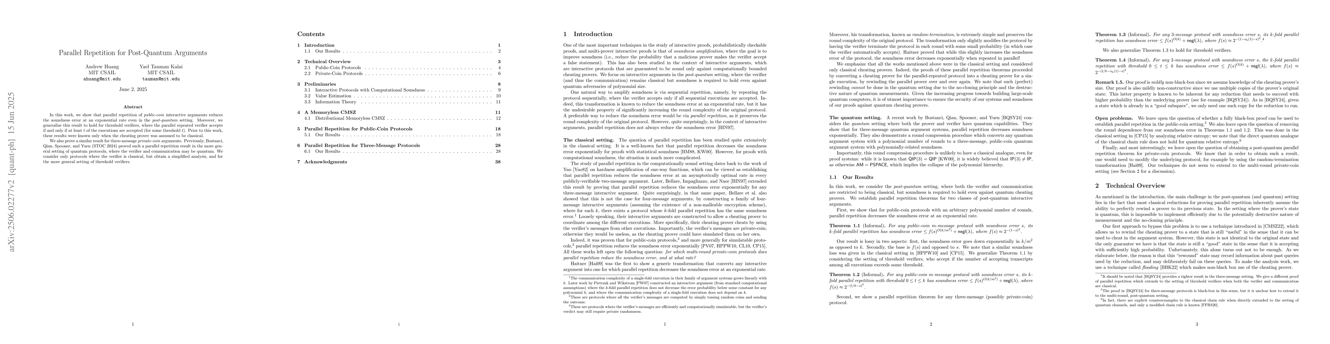 This research demonstrates that parallel repetition of public-coin arguments exponentially reduces soundness error in post-quantum settings, extending previous classical prover assumptions. It also covers threshold verifiers accepting on at least t executions and simplifies analysis for three-message private-coin arguments, offering a clearer understanding compared to prior quantum protocol studies.