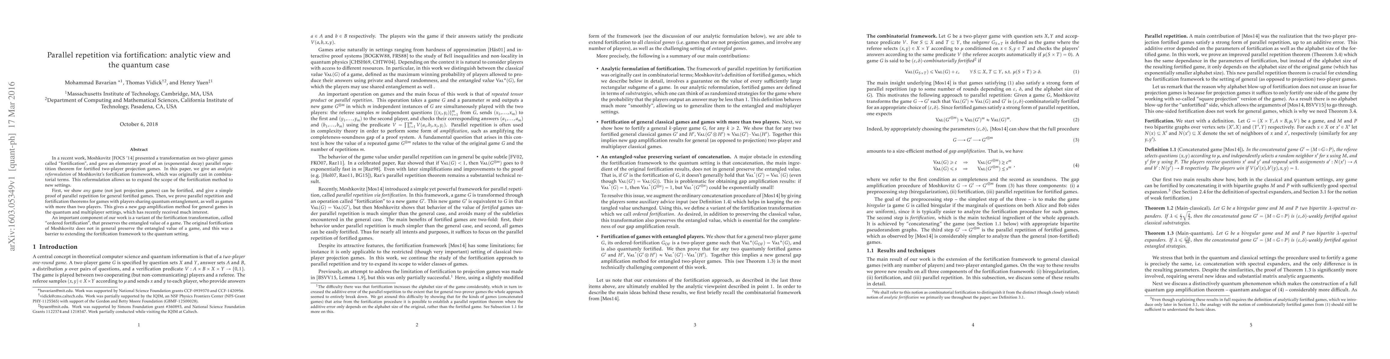 In a recent work, Moshkovitz [FOCS '14] presented a transformation on two-player games called "fortification", and gave an elementary proof of an (exponential decay) parallel repetition theorem for fortified two-player projection games. In this paper, we give an analytic reformulation of Moshkovitz's fortification framework, which was originally cast in combinatorial terms. This reformulation allows us to expand the scope of the fortification method to new settings. First, we show any game (not just projection games) can be fortified, and give a simple proof of parallel repetition for general fortified games. Then, we prove parallel repetition and fortification theorems for games with players sharing quantum entanglement, as well as games with more than two players. This gives a new gap amplification method for general games in the quantum and multiplayer settings, which has recently received much interest. An important component of our work is a variant of the fortification transformation, called "ordered fortification", that preserves the entangled value of a game. The original fortification of Moshkovitz does not in general preserve the entangled value of a game, and this was a barrier to extending the fortification framework to the quantum setting.