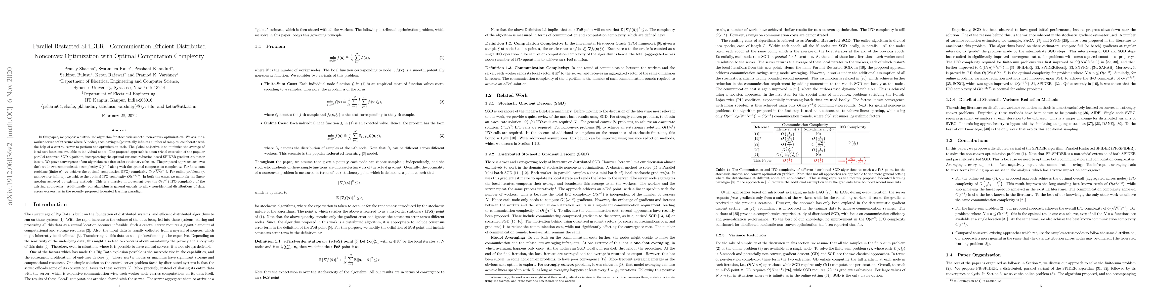 This paper introduces a distributed optimization algorithm for stochastic non-convex problems, extending parallel-restarted SGD with the SPIDER gradient estimator. It achieves optimal communication and computation complexities, significantly improving over existing methods.