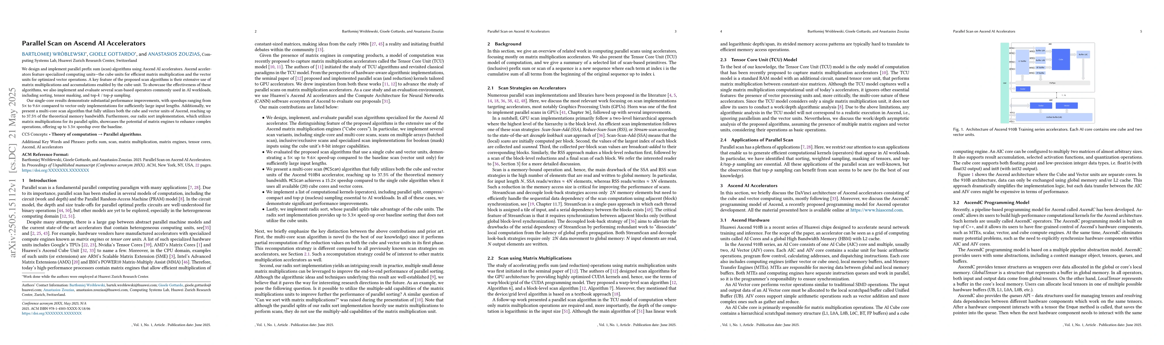 Researchers designed parallel prefix sum algorithms for Ascend AI accelerators, achieving significant performance improvements of up to 9.6x and showcasing the potential for matrix engines in complex operations.
