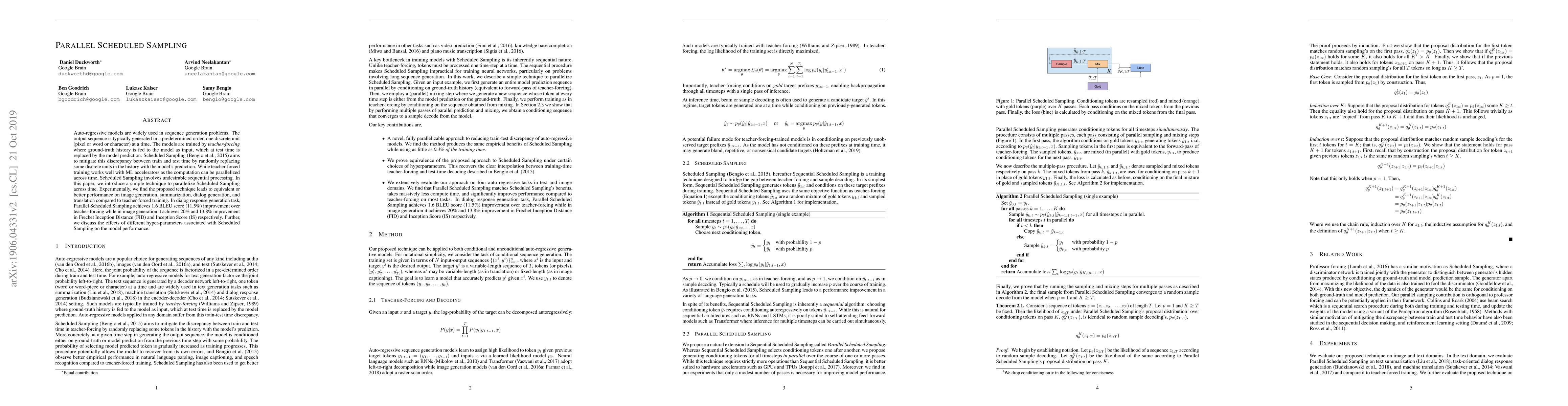 Auto-regressive models are widely used in sequence generation problems. The output sequence is typically generated in a predetermined order, one discrete unit (pixel or word or character) at a time. The models are trained by teacher-forcing where ground-truth history is fed to the model as input, which at test time is replaced by the model prediction. Scheduled Sampling aims to mitigate this discrepancy between train and test time by randomly replacing some discrete units in the history with the model's prediction. While teacher-forced training works well with ML accelerators as the computation can be parallelized across time, Scheduled Sampling involves undesirable sequential processing. In this paper, we introduce a simple technique to parallelize Scheduled Sampling across time. Experimentally, we find the proposed technique leads to equivalent or better performance on image generation, summarization, dialog generation, and translation compared to teacher-forced training. In dialog response generation task, Parallel Scheduled Sampling achieves 1.6 BLEU score (11.5%) improvement over teacher-forcing while in image generation it achieves 20% and 13.8% improvement in Frechet Inception Distance (FID) and Inception Score (IS) respectively. Further, we discuss the effects of different hyper-parameters associated with Scheduled Sampling on the model performance.