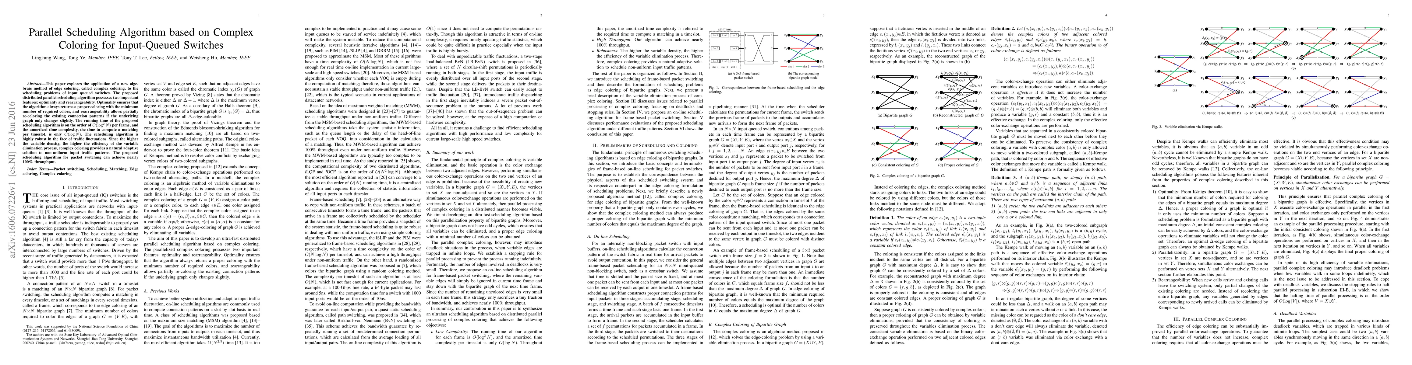 This paper introduces a parallel scheduling algorithm based on complex coloring for input-queued switches, ensuring optimality and rearrangeability. The algorithm achieves nearly 100% throughput with an efficient adaptive solution to non-uniform traffic patterns.