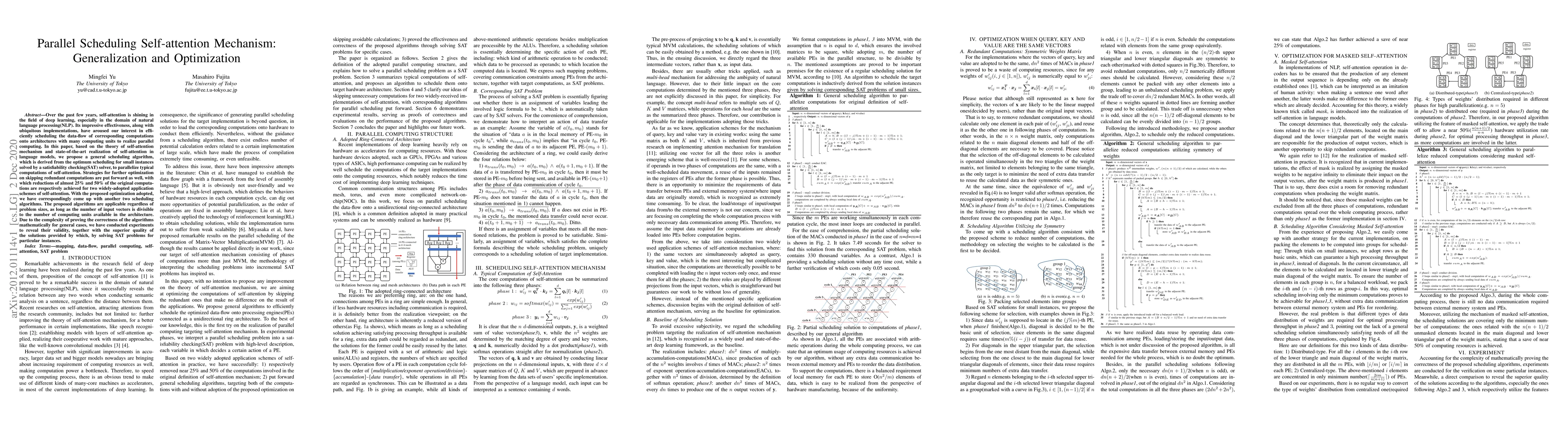 Over the past few years, self-attention is shining in the field of deep learning, especially in the domain of natural language processing(NLP). Its impressive effectiveness, along with ubiquitous implementations, have aroused our interest in efficiently scheduling the data-flow of corresponding computations onto architectures with many computing units to realize parallel computing. In this paper, based on the theory of self-attention mechanism and state-of-the-art realization of self-attention in language models, we propose a general scheduling algorithm, which is derived from the optimum scheduling for small instances solved by a satisfiability checking(SAT) solver, to parallelize typical computations of self-attention. Strategies for further optimization on skipping redundant computations are put forward as well, with which reductions of almost 25% and 50% of the original computations are respectively achieved for two widely-adopted application schemes of self-attention. With the proposed optimization adopted, we have correspondingly come up with another two scheduling algorithms. The proposed algorithms are applicable regardless of problem sizes, as long as the number of input vectors is divisible to the number of computing units available in the architecture. Due to the complexity of proving the correctness of the algorithms mathematically for general cases, we have conducted experiments to reveal their validity, together with the superior quality of the solutions provided by which, by solving SAT problems for particular instances.