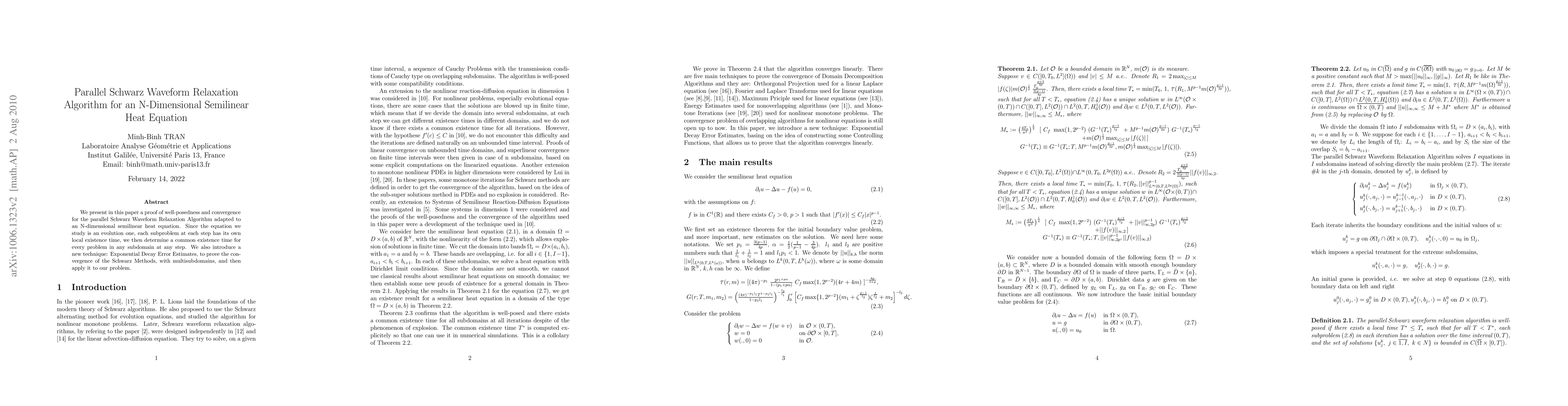 We present in this paper a proof of well-posedness and convergence for the parallel Schwarz Waveform Relaxation Algorithm adapted to an N-dimensional semilinear heat equation. Since the equation we study is an evolution one, each subproblem at each step has its own local existence time, we then determine a common existence time for every problem in any subdomain at any step. We also introduce a new technique: Exponential Decay Error Estimates, to prove the convergence of the Schwarz Methods, with multisubdomains, and then apply it to our problem.