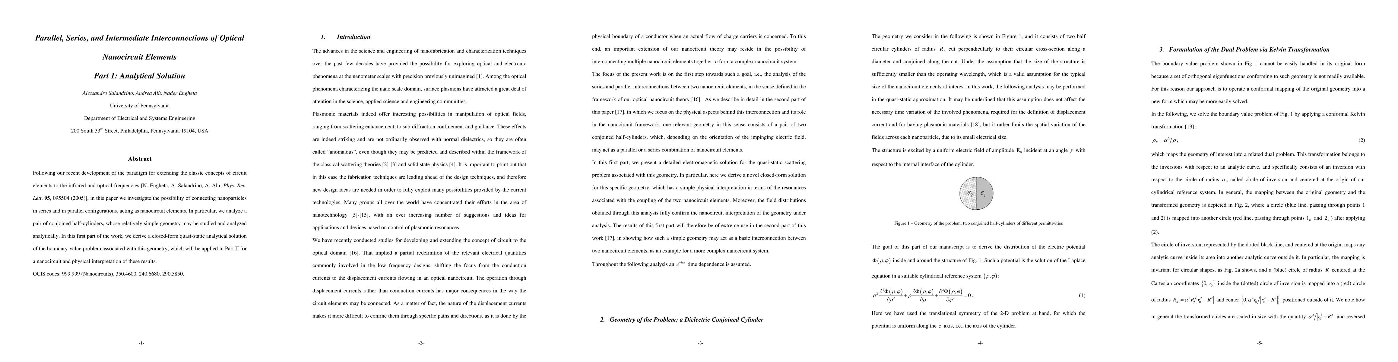 This paper extends classic circuit concepts to optical frequencies, deriving a closed-form analytical solution for the interconnection of nanoparticles in series and parallel configurations, specifically for a pair of conjoined half-cylinders. This solution will be utilized in subsequent parts to interpret nanocircuit behavior.