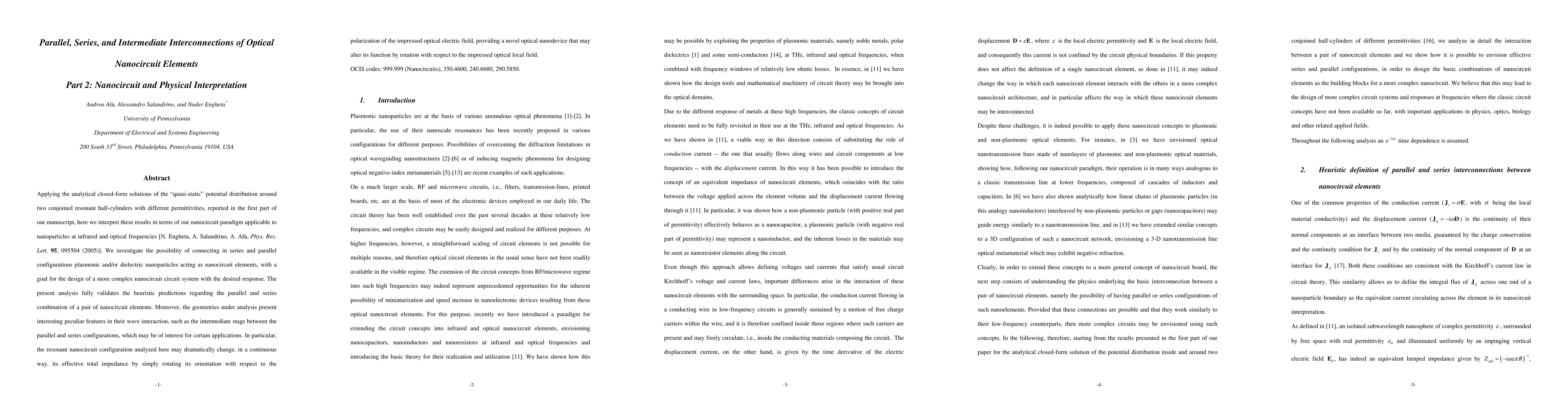 Applying the analytical closed-form solutions of the 'quasi-static' potential distribution around two conjoined resonant half-cylinders with different permittivities, reported in the first part of our manuscript, here we interpret these results in terms of our nanocircuit paradigm applicable to nanoparticles at infrared and optical frequencies [N. Engheta, A. Salandrino, A. Alu, Phys. Rev. Lett. 95, 095504 (2005)]. We investigate the possibility of connecting in series and parallel configurations plasmonic and/or dielectric nanoparticles acting as nanocircuit elements, with a goal for the design of a more complex nanocircuit circuit system with the desired response. The present analysis fully validates the heuristic predictions regarding the parallel and series combination of a pair of nanocircuit elements. Moreover, the geometries under analysis present interesting peculiar features in their wave interaction, such as the intermediate stage between the parallel and series configurations, which may be of interest for certain applications. In particular, the resonant nanocircuit configuration analyzed here may dramatically change, in a continuous way, its effective total impedance by simply rotating its orientation with respect to the polarization of the impressed optical electric field, providing a novel optical nanodevice that may alter its function by rotation with respect to the impressed optical local field.