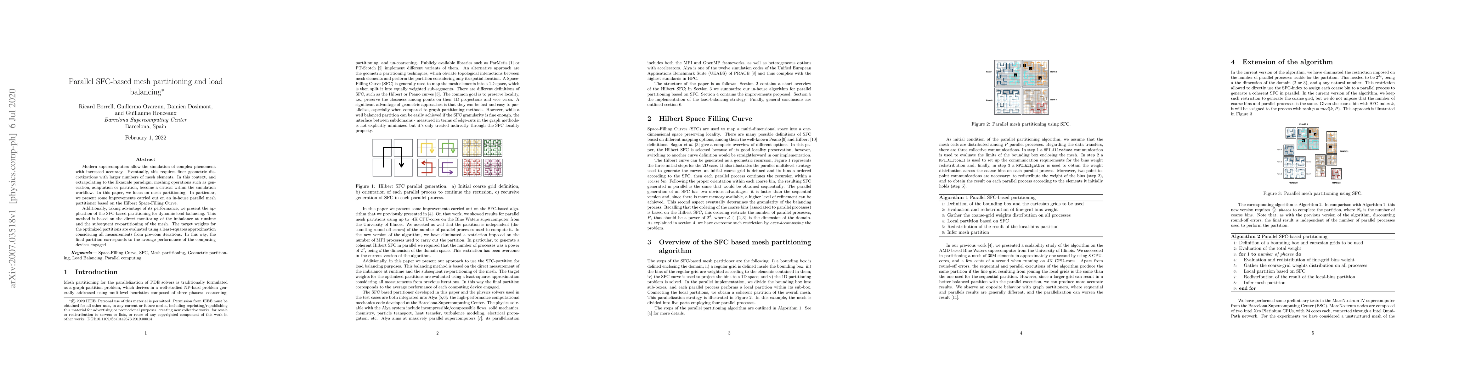 This paper presents enhancements to a parallel mesh partitioner based on the Hilbert Space-Filling Curve, focusing on improving mesh partitioning efficiency for large-scale simulations. It also introduces a dynamic load balancing method using SFC-based partitioning, which re-partitions the mesh based on runtime imbalance and least-squares approximation of previous iterations' performance data.