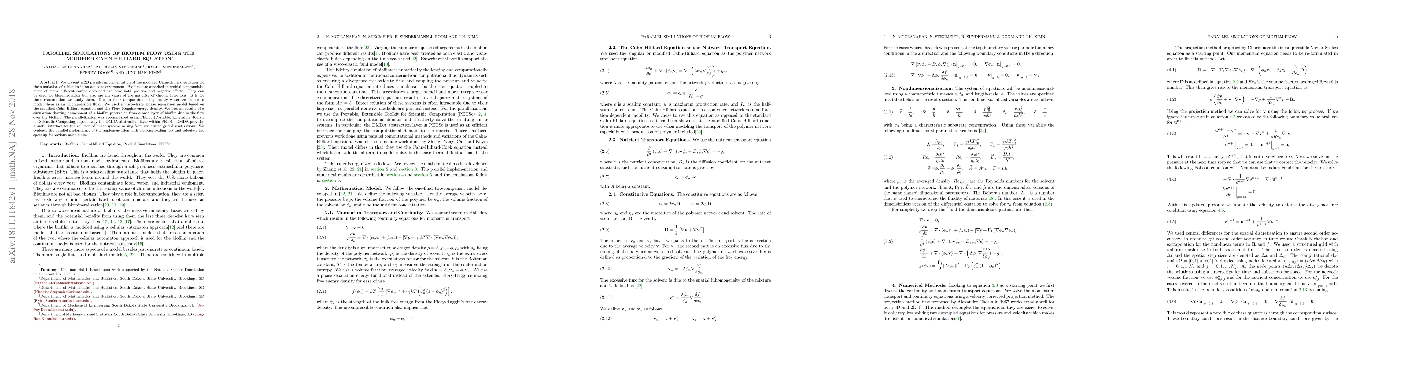 We present a 2D parallel implementation of the modified Cahn-Hilliard equation for the simulation of a biofilm in an aqueous enviroment. Biofilms are attached microbial communities made of many different components and can have both positive and negative effects. They can be used for bioremediation but also are the cause of the majority of chronic infections. It is for these reasons that we study them. Due to their composition being mostly water we choose to model them as an incompressible fluid. We used a visco-elastic phase separation model based on the modified Cahn-Hilliard equation and the Flory-Huggins energy density. We present results of a simulation showing detachment of a biofilm protrusion from a base layer of biofilm due to the flow over the biofilm. The parallelization was accomplished using PETSc (Portable, Extensible Toolkit for Scientific Computing), specifically the DMDA abstraction layer within PETSc. DMDA provides a useful interface for the solution of linear systems arising from structured grid discretizations. We evaluate the parallel performance of the implementation with a strong scaling test and calculate the speedup for various mesh sizes.