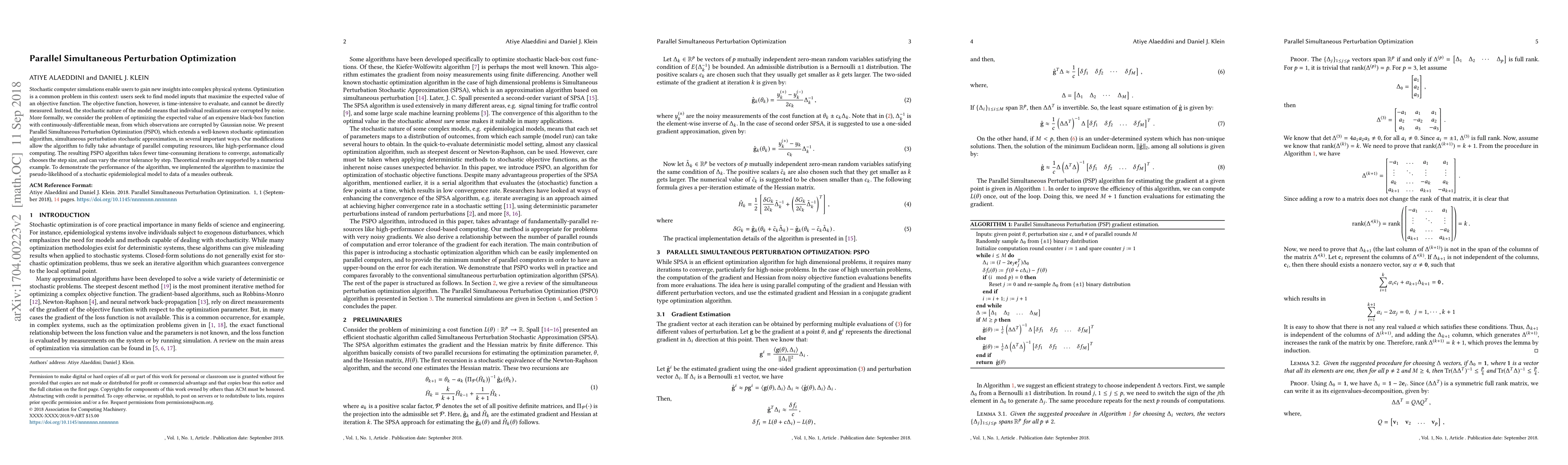 The paper introduces Parallel Simultaneous Perturbation Optimization (PSPO) to optimize expensive black-box functions corrupted by Gaussian noise, leveraging parallel computing for faster convergence. The PSPO algorithm improves upon simultaneous perturbation stochastic approximation by automatically adjusting step size and error tolerance, demonstrated through a measles outbreak model.