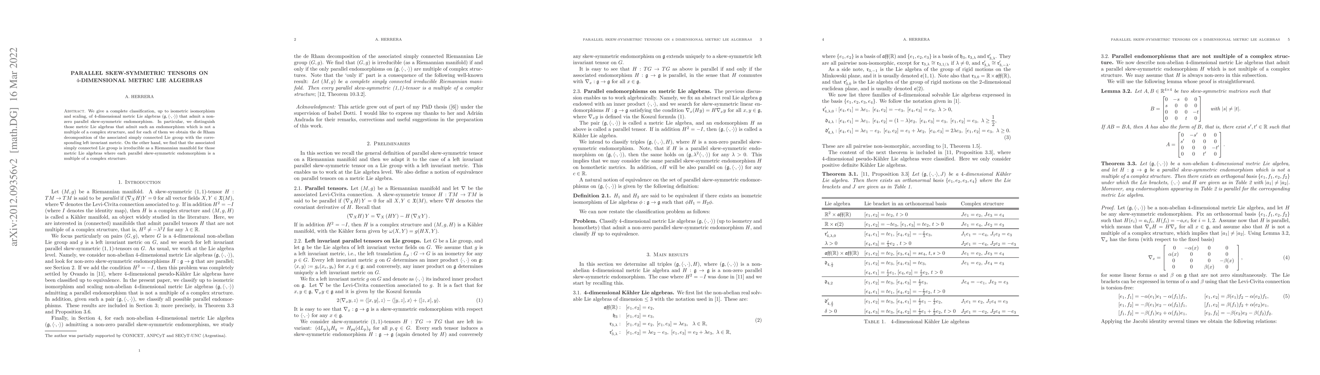This paper classifies $4$-dimensional metric Lie algebras with non-zero parallel skew-symmetric endomorphisms, distinguishing those with endomorphisms not multiples of complex structures and providing their de Rham decompositions. It also shows that the associated Lie groups are irreducible as Riemannian manifolds when all parallel skew-symmetric endomorphisms are multiples of complex structures.