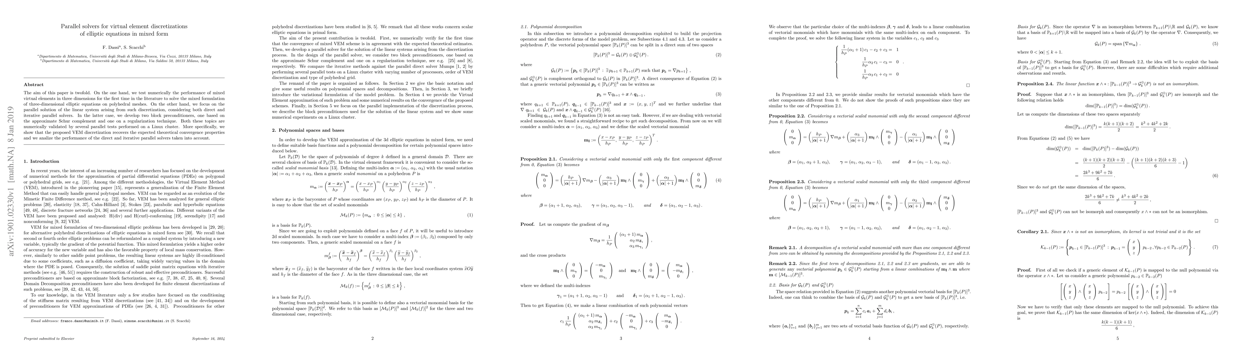 This paper tests mixed virtual elements in 3D for the first time to solve elliptic equations on polyhedral meshes, alongside parallel solvers for the resulting linear systems, including two block preconditioners. Numerical validation on a Linux cluster confirms the theoretical convergence and performance of the proposed methods.
