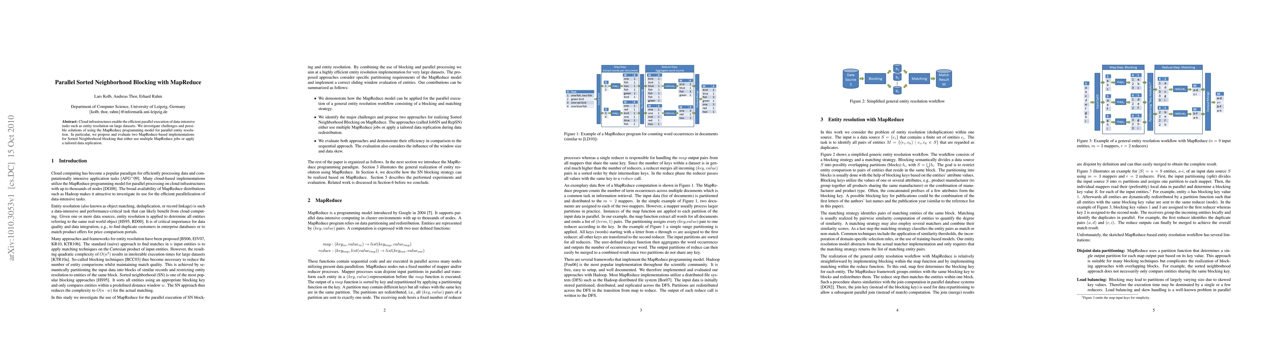 This paper explores using MapReduce for parallel entity resolution, proposing two implementations of Sorted Neighborhood blocking: one employing multiple MapReduce jobs and the other utilizing data replication to optimize performance.